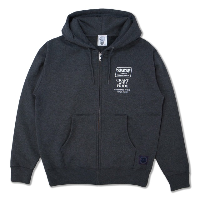 極厚12.4ozのタフなボディを使用したジップアップフーディ。裏起毛で保温性の高いアイテム。フロントにロゴプリント、背面裾に★刺繍を配置しています。 NO. : 26MMSW08 COLOR : CHACOAL QUALITY : COTTON 65% , POLYESTER 35%