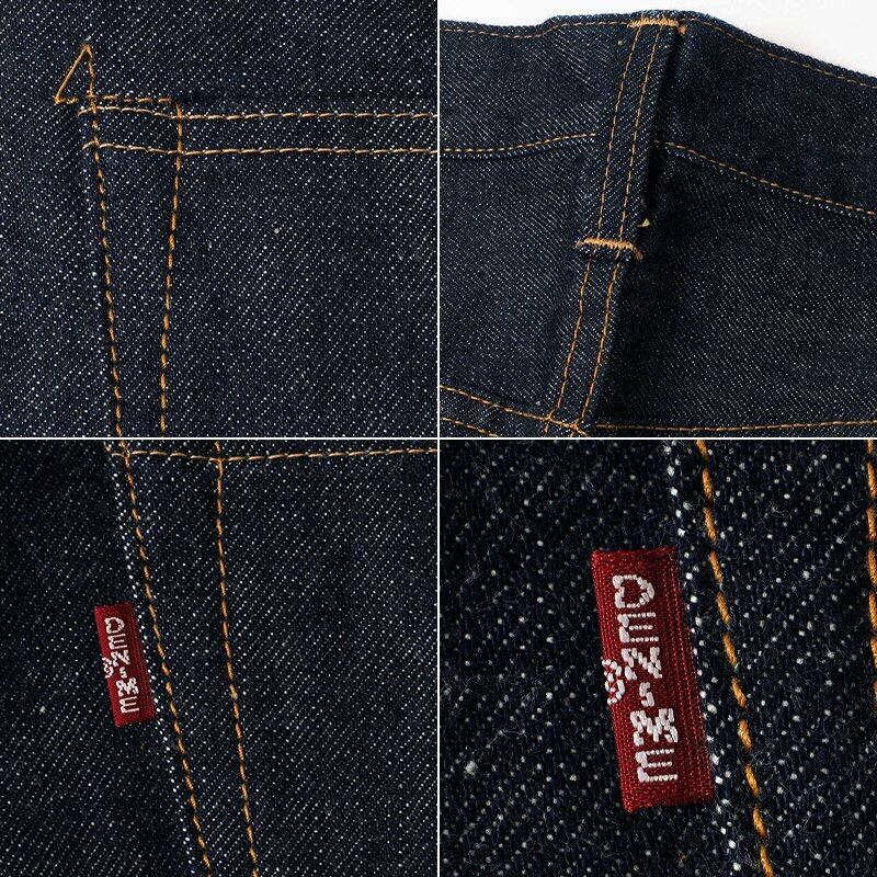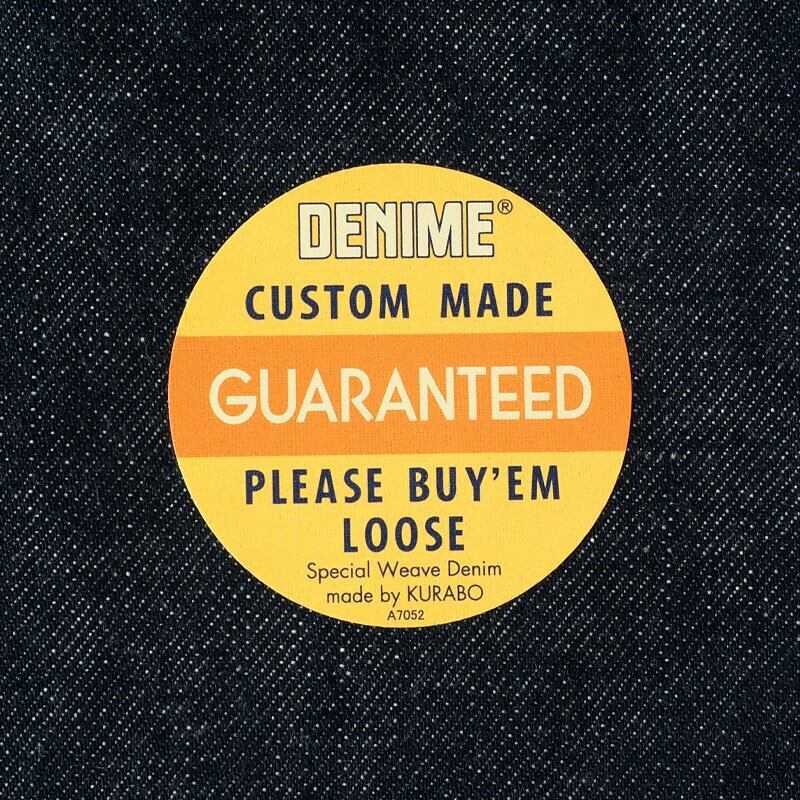 DENIMEが創業当時に製造した当時の生地のレシピを参考にクラボウとの共同開発により実現したもので、当時と同じ米綿をリング紡績したムラ糸を専用色のインディゴをロープ染色、仕上げに草木染めを施すことで、深みのあるDENIMEらしい色が再現されました。また、ロープ染色前に行う精練も常温の水にすることで、染まる箇所は濃く中白(なかじろ)がしっかりと残るメリハリの強い経糸となりました。力織機は旧式で知られるGL3織機を使用しているため、ムラ糸の特徴がそのままデニムにあわられています。まさにDENIMEのオリジナリティと、ウエアハウスの探究心が合体した日本のデニムの最高峰を目指すジーンズとなりました。
