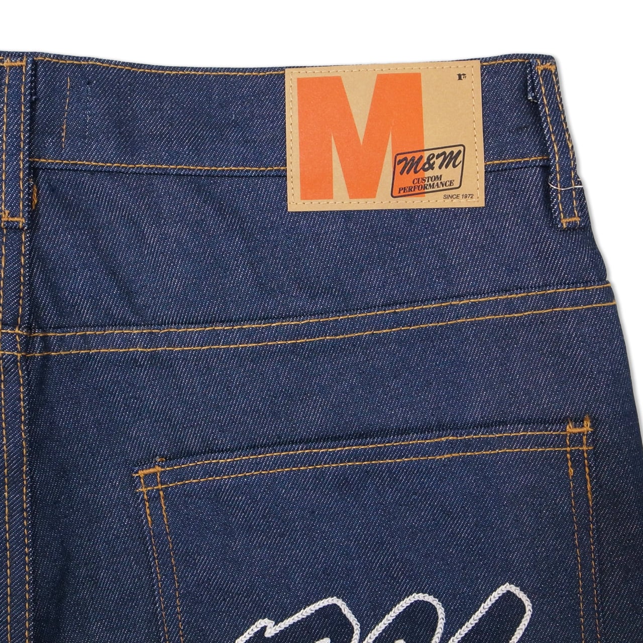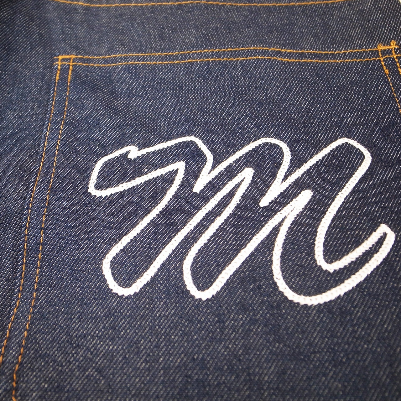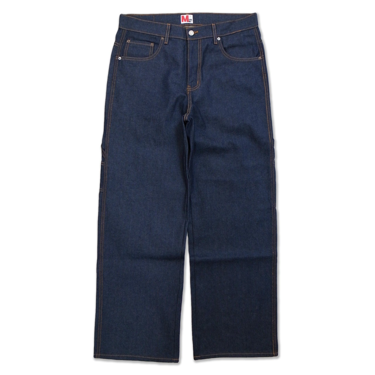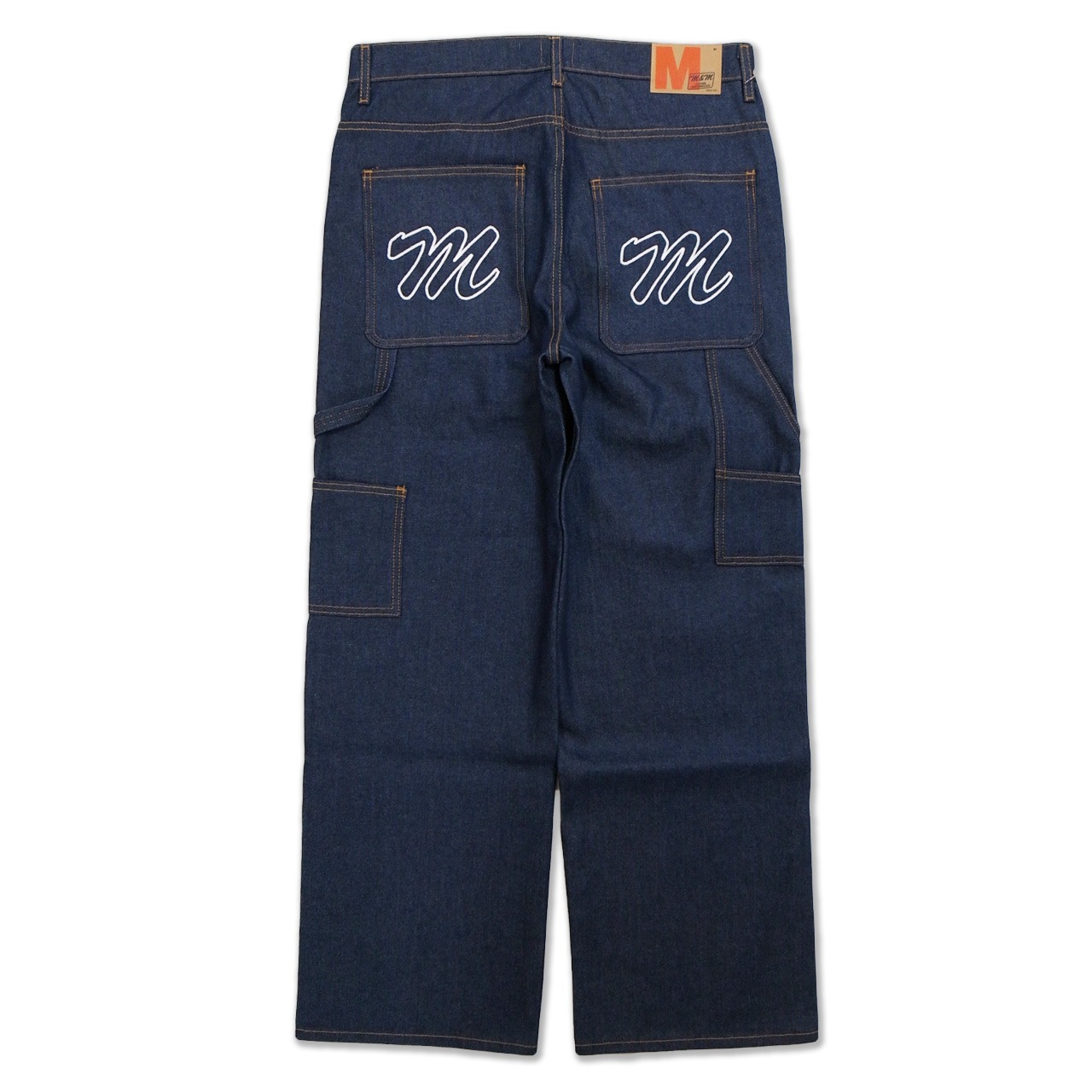 5ポケットのペインタージーンズ。ルーズストレートのバギーフィットシルエットで、スケールポケットやハンマーループなど、実用的なギミックが盛り込まれている。後ポケットにはmmチェーン刺繍が配置されたデザイン。
