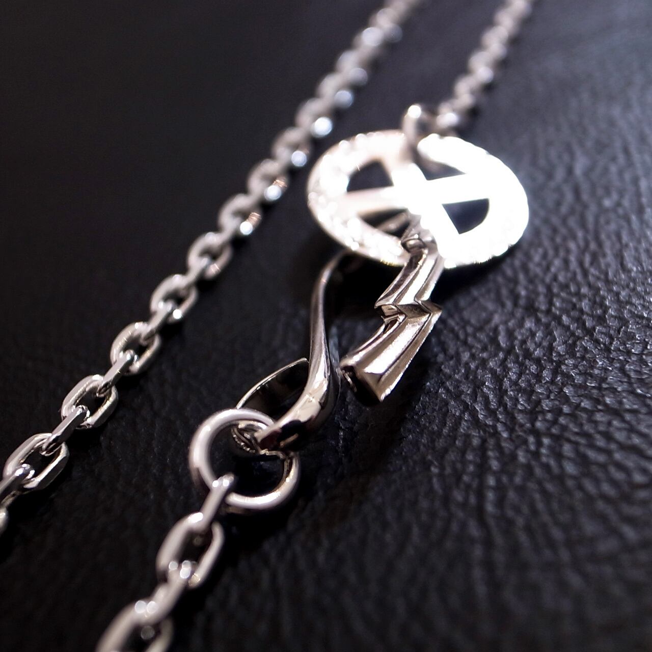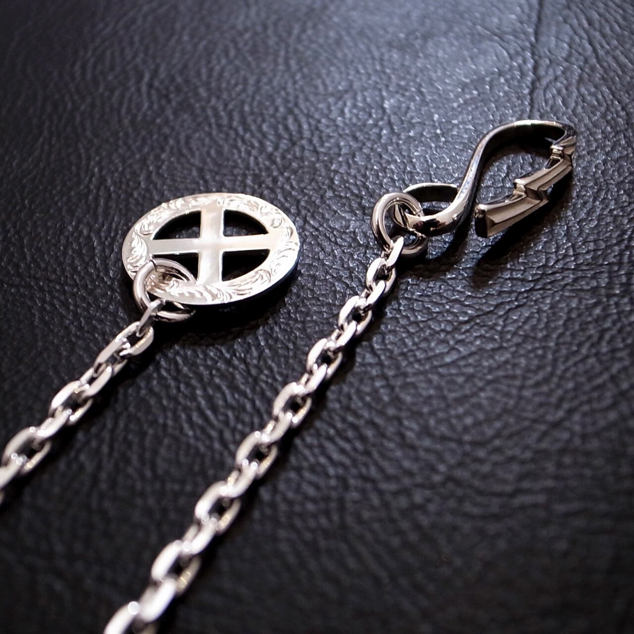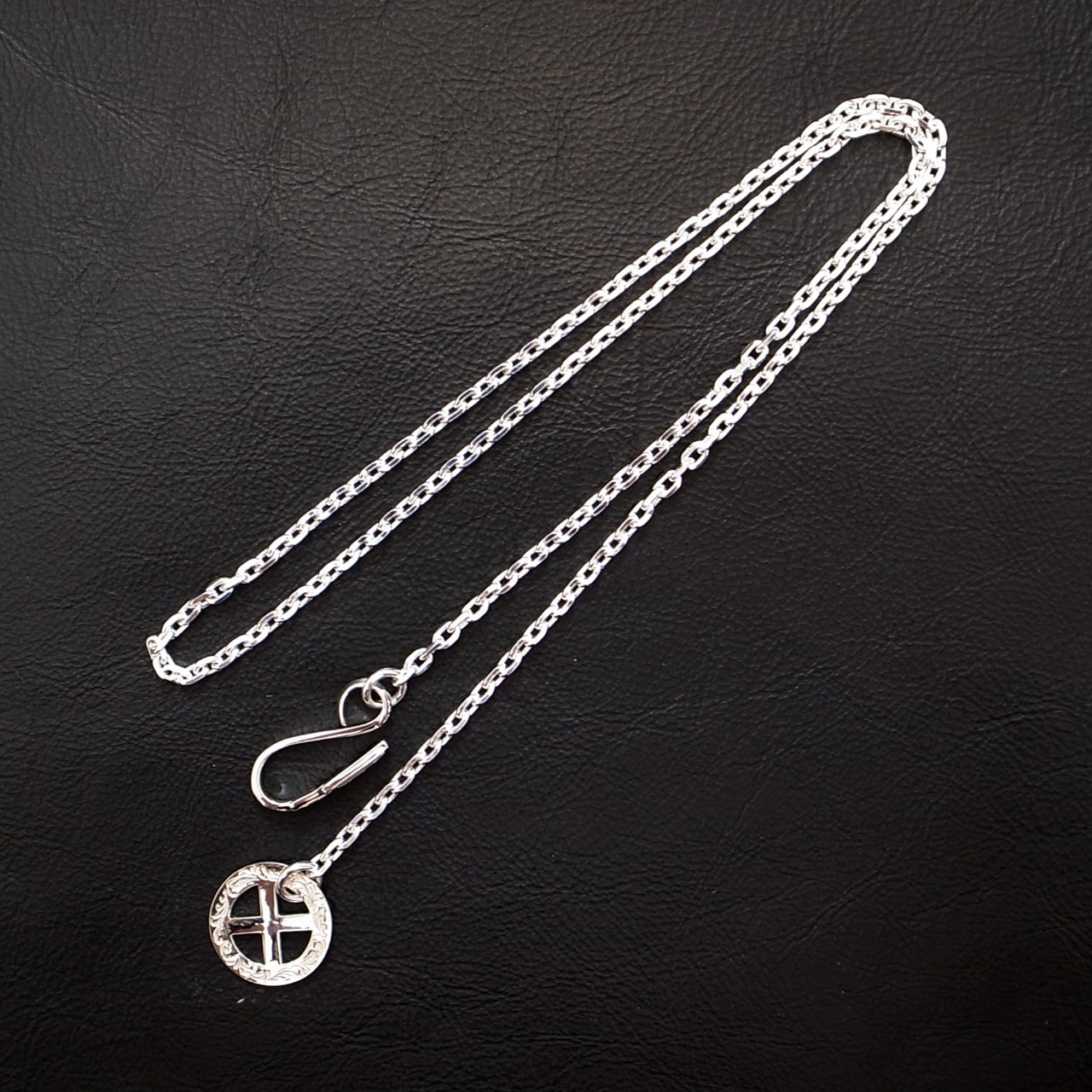 TARO WASHIMIのスタンダードアイテム、サンダーフックメディスンホイールチェーン。角デザインのチェーンです。こちらはアラベスクデザインのホイールです。通常長さにチェーン長さを+10cm延長した60cmのモデル。