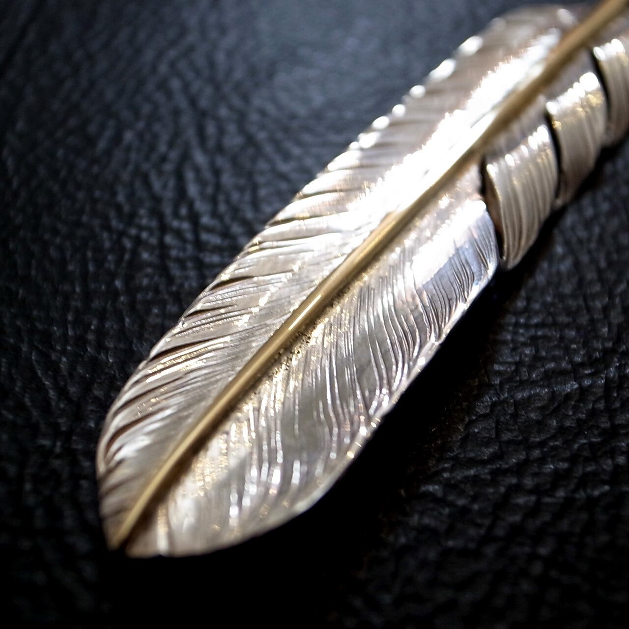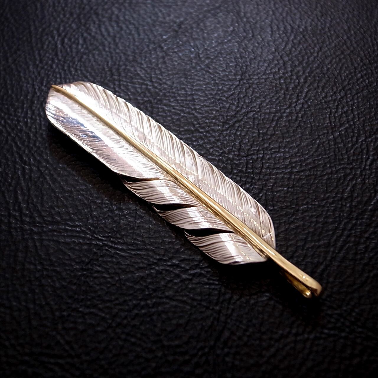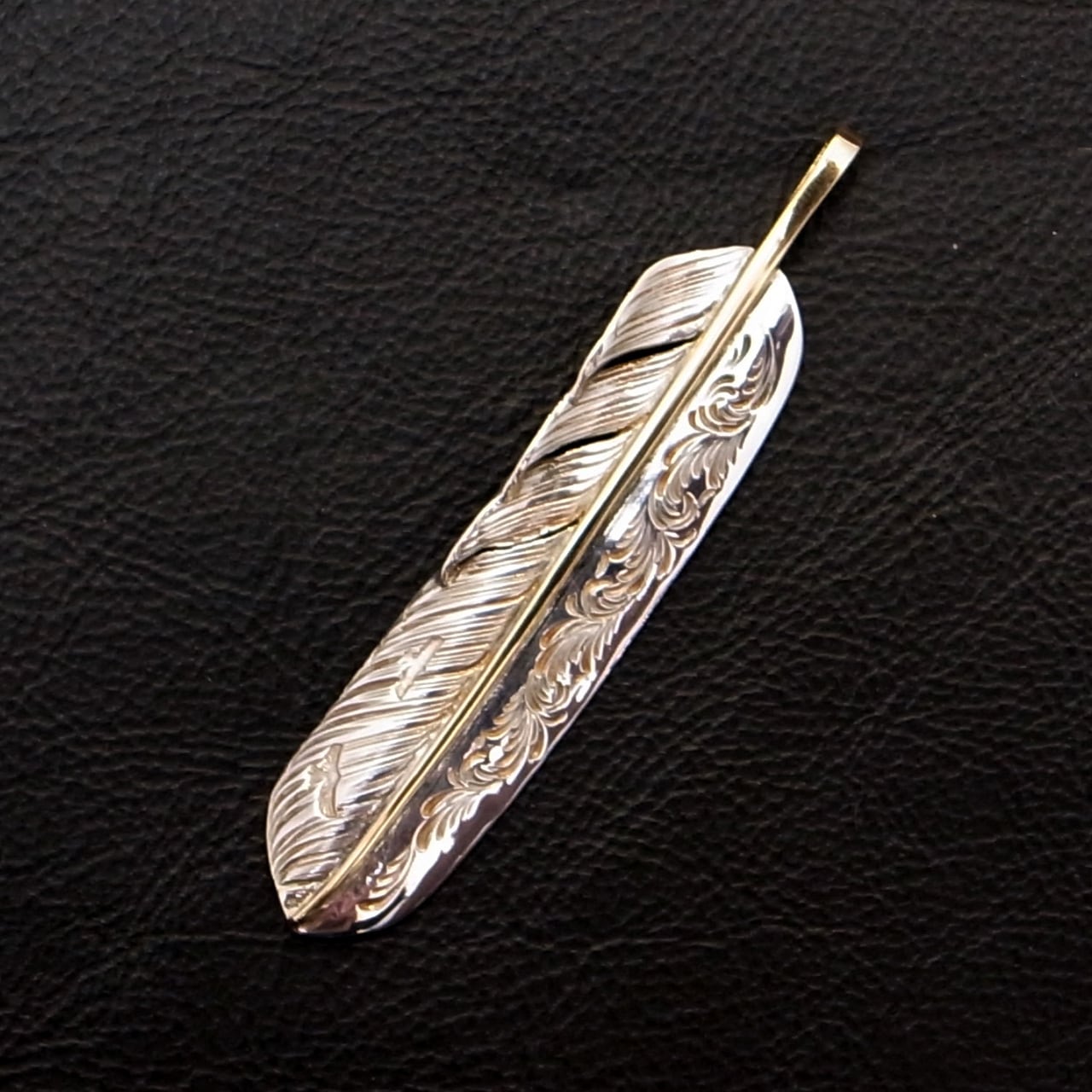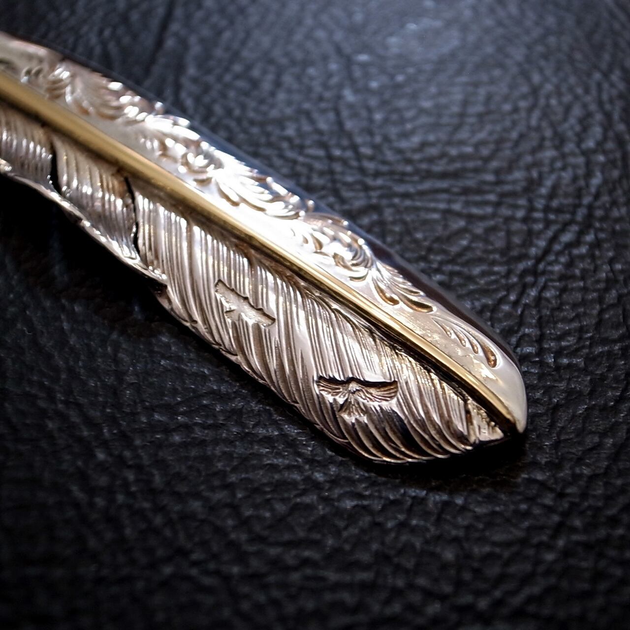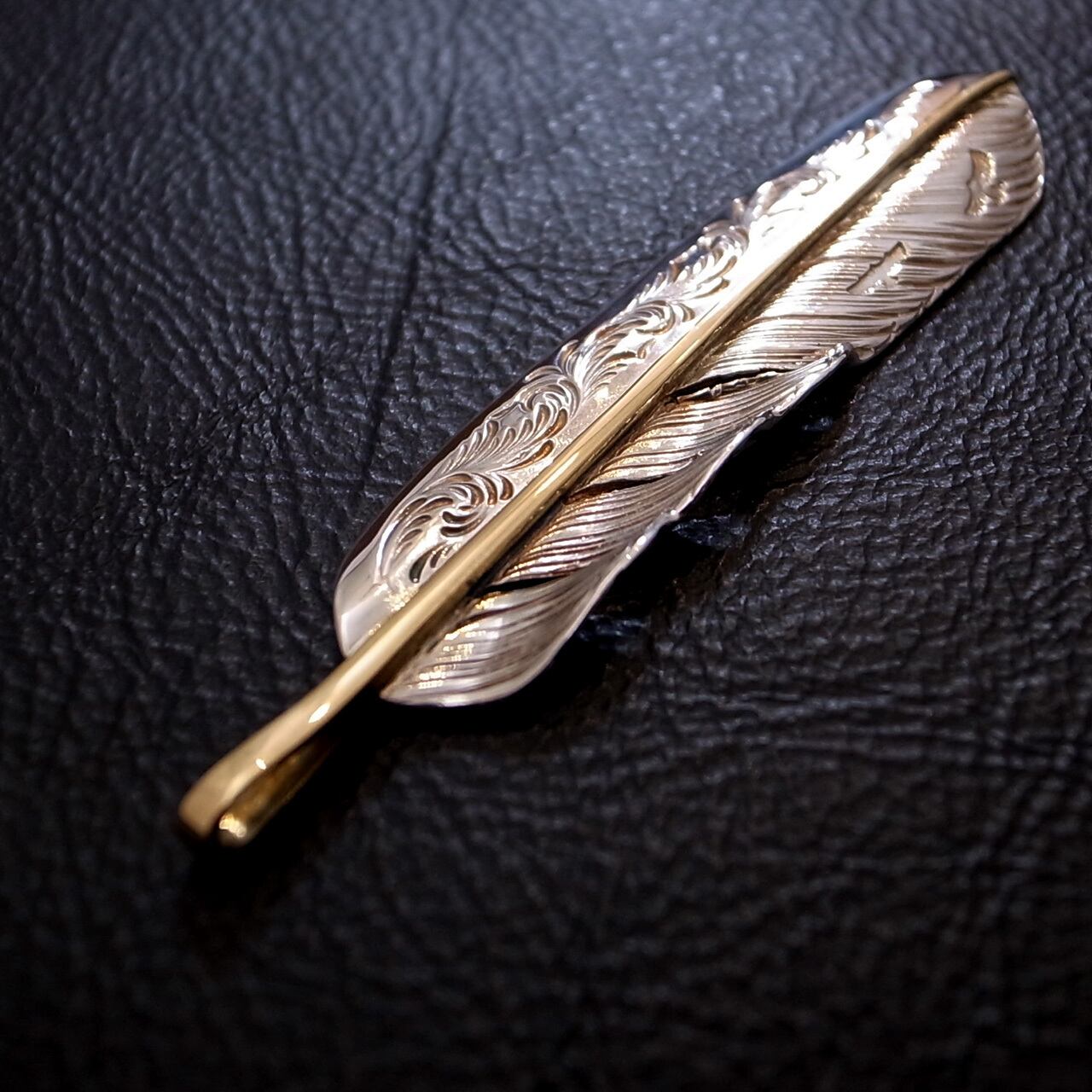 L サイズのアラベスクフライトフェザー02をベースにコア部分にK18 ゴールドを用いた綺麗なコントラストを持つフェザー。アラベスクデザインと、美しい羽の彫金、中心部分のゴールドという重なりは唯一無二の美しさを持っています。