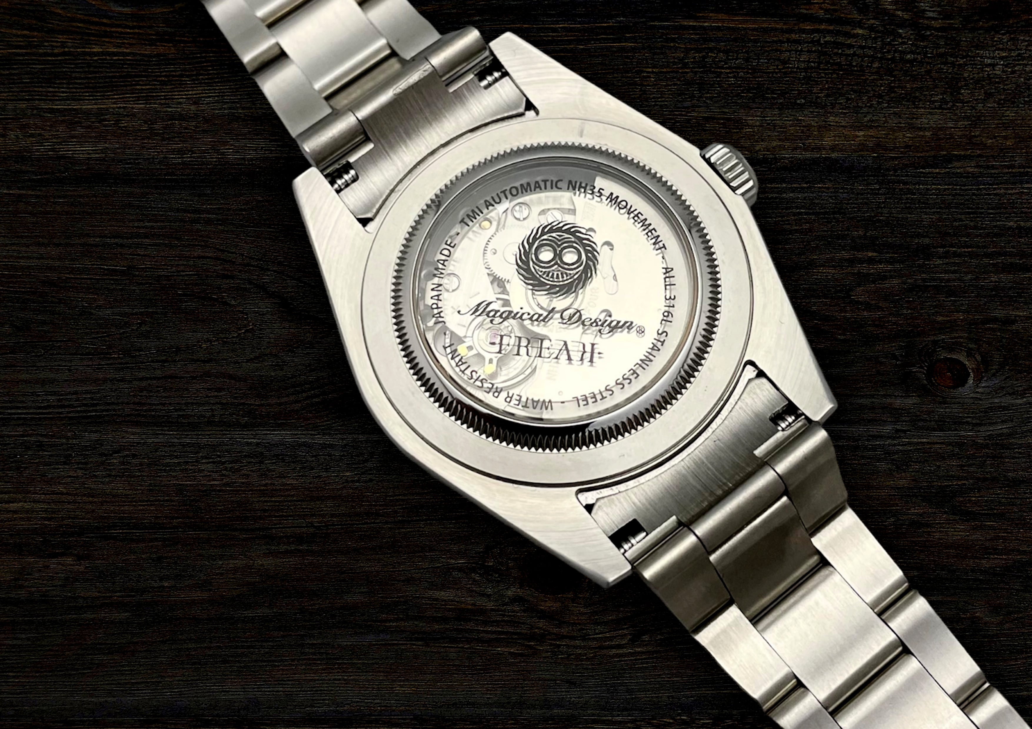 日本製機械式ムーブメントを使用し、時計職人がひとつひとつ組み立てている職人気質な FREAK の腕時計と MAGICAL DESIGN がタッグを組むことで、時計にアート性が加わり、新たな個性と価値を生み出しています。