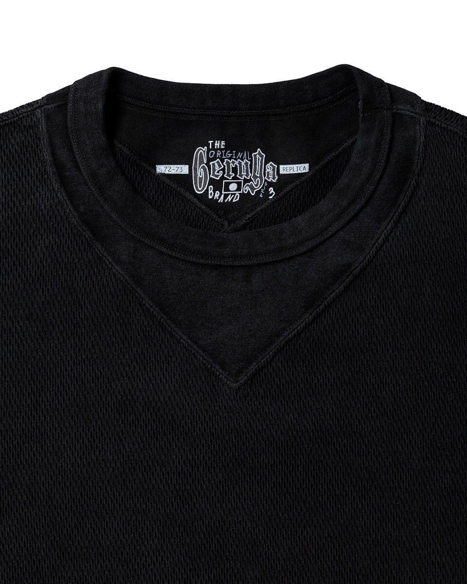 伸縮性の大きいハニカムサーマル生地に、キックバックの強いスパンフライスを組み合わせ、タフで型崩れしにくく長く愛用できる一枚に仕上がっています。襟元に変形ガセットをはめ込んだ特徴的なデザイン。袖口から肘にかけてスパンフライスを当てて二重構造になっています。
