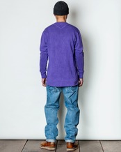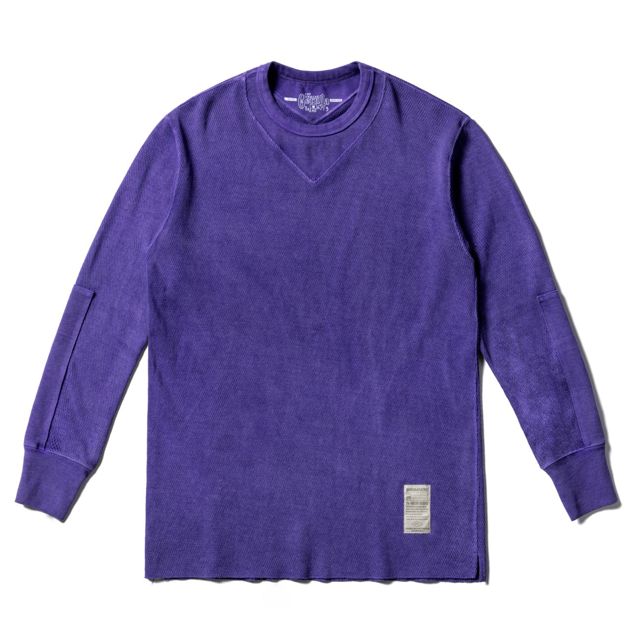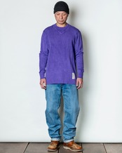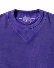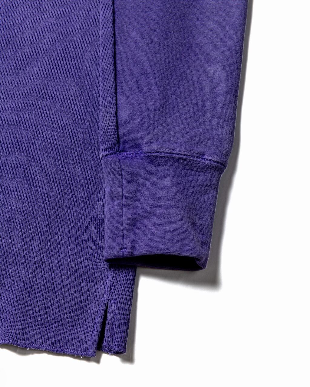 伸縮性の大きいハニカムサーマル生地に、キックバックの強いスパンフライスを組み合わせ、タフで型崩れしにくく長く愛用できる一枚に仕上がっています。襟元に変形ガセットをはめ込んだ特徴的なデザイン。袖口から肘にかけてスパンフライスを当てて二重構造になっています。