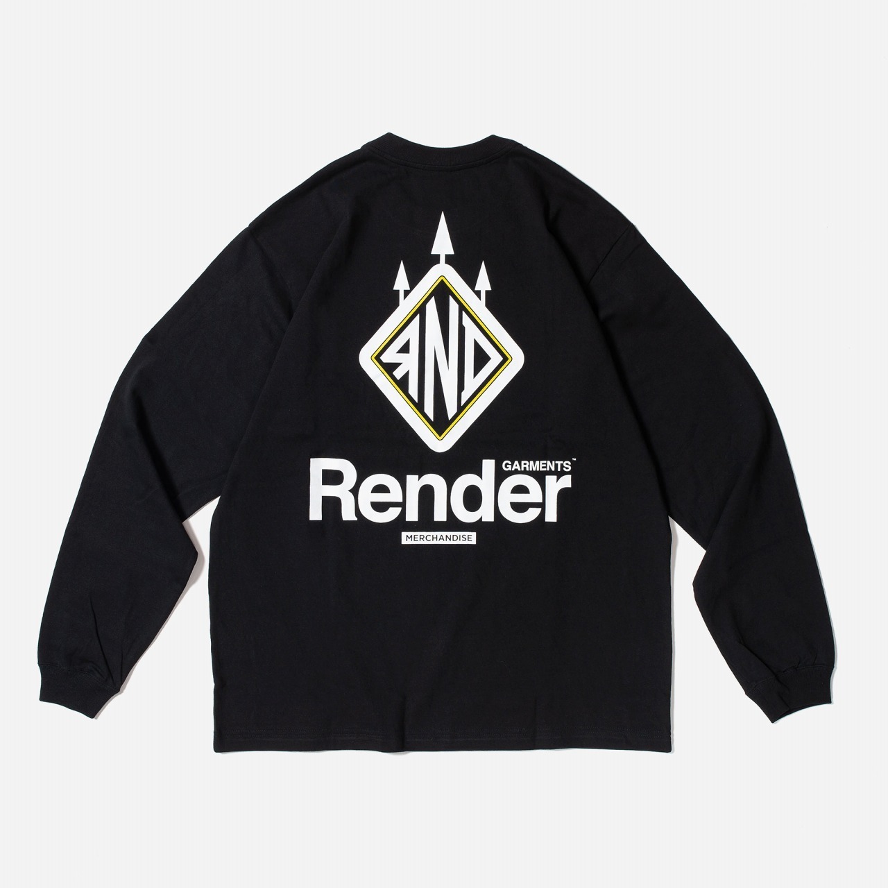 首ぐりと袖口のフライス素材も度詰め引き揃え加工を施し耐久性に優れています。フロント左胸にRenderロゴグラフィック。バックはRenderシグネイチャーロゴのグラフィックをプリント。