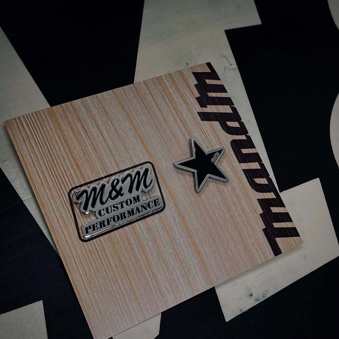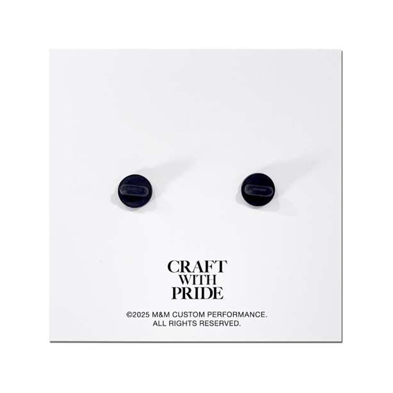 M&Mのロゴと★型の2個セットのピンバッジ。専用台紙付き。留め具には着脱しやすいラバークラッチを使用。1.4mm厚の鉄製ベースによる、重みと存在感のある仕上がり。金属板に金型で凹凸をつける「スタンププレス」製法を採用し、繊細なディティールをシャープに表現しています。