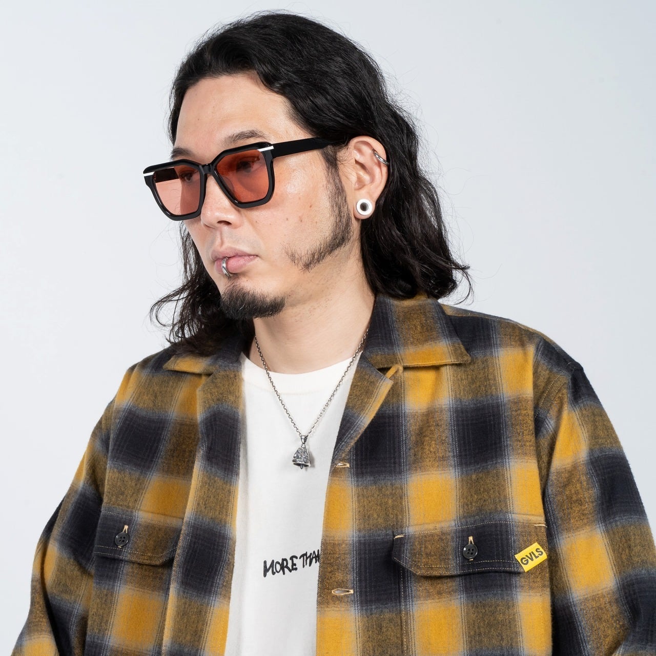 比較的大ぶりのシルエットにフレームを細めに設定して、メガネ・サングラス両方で使えるデザインに落とし込んだアイウェア。GVLSサングラスの特徴であるサイドの白いラインがらしさを演出してくれます。