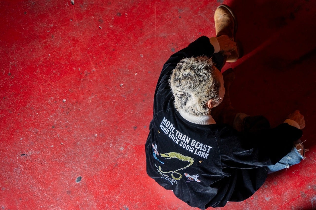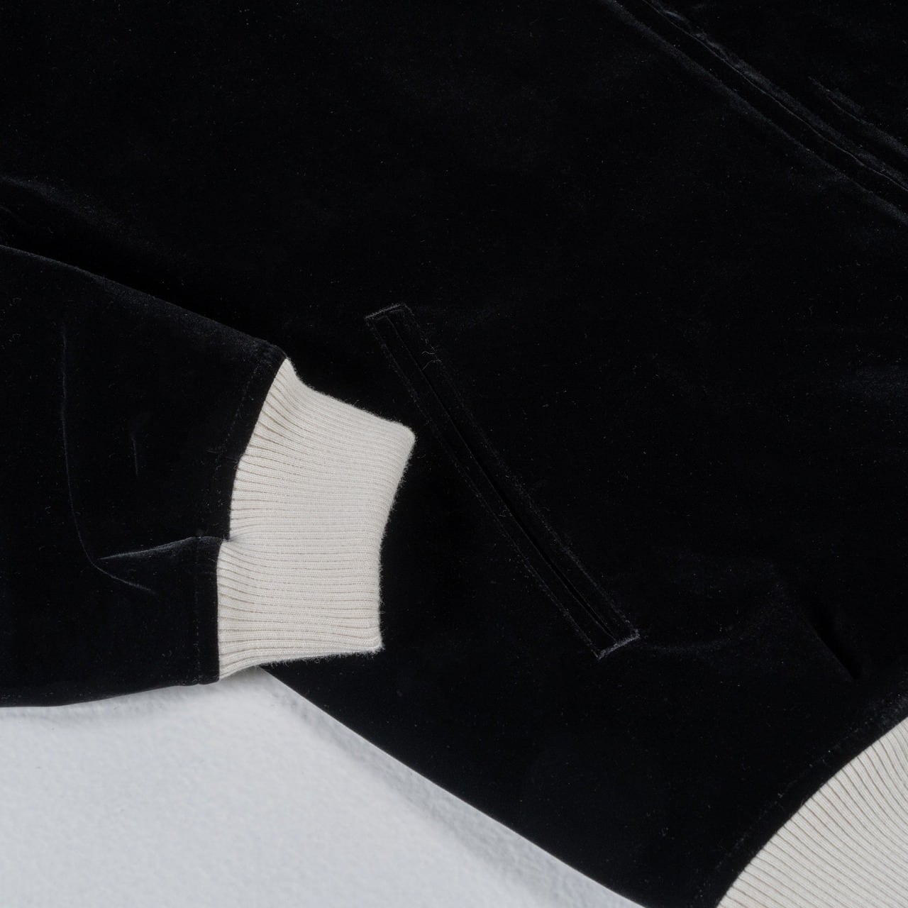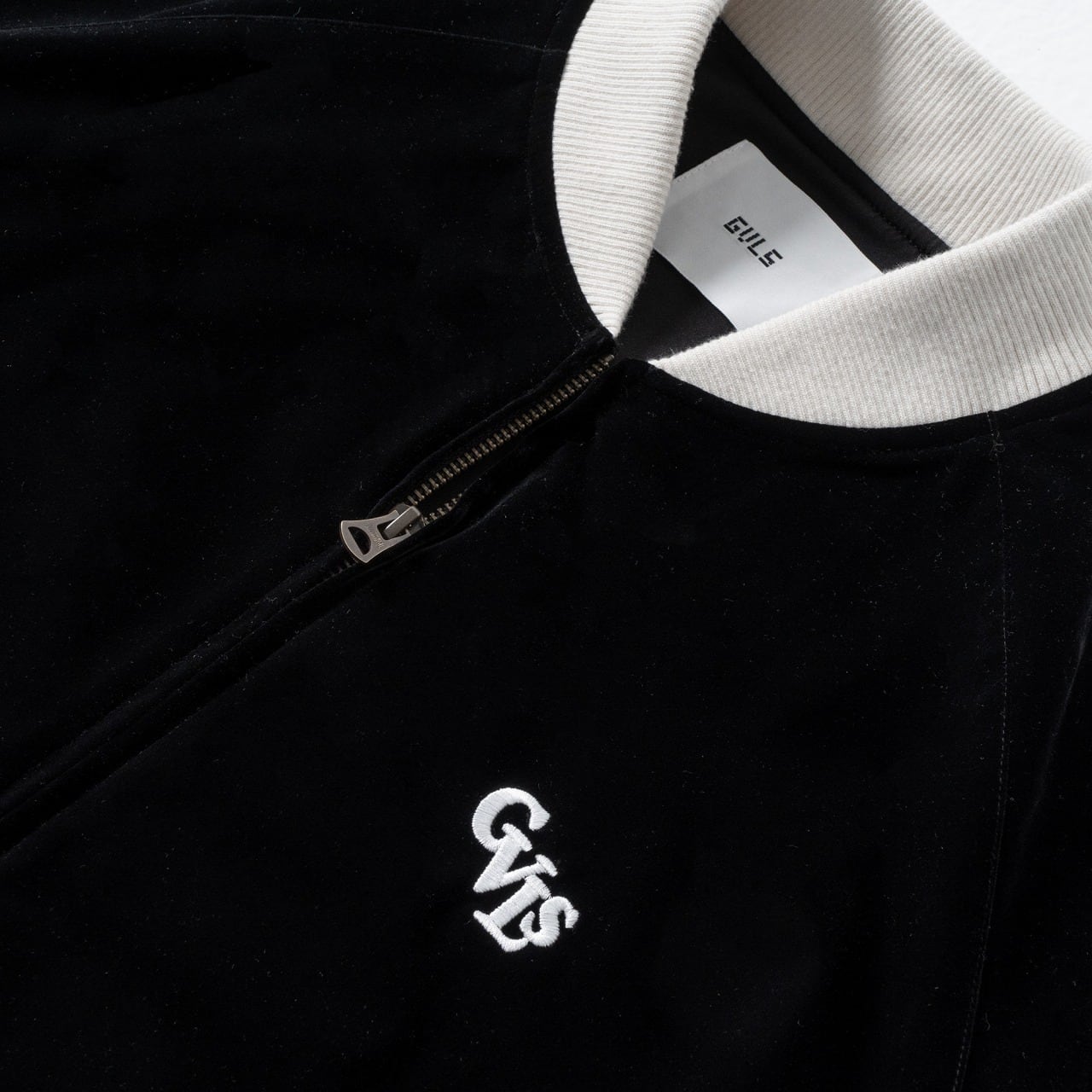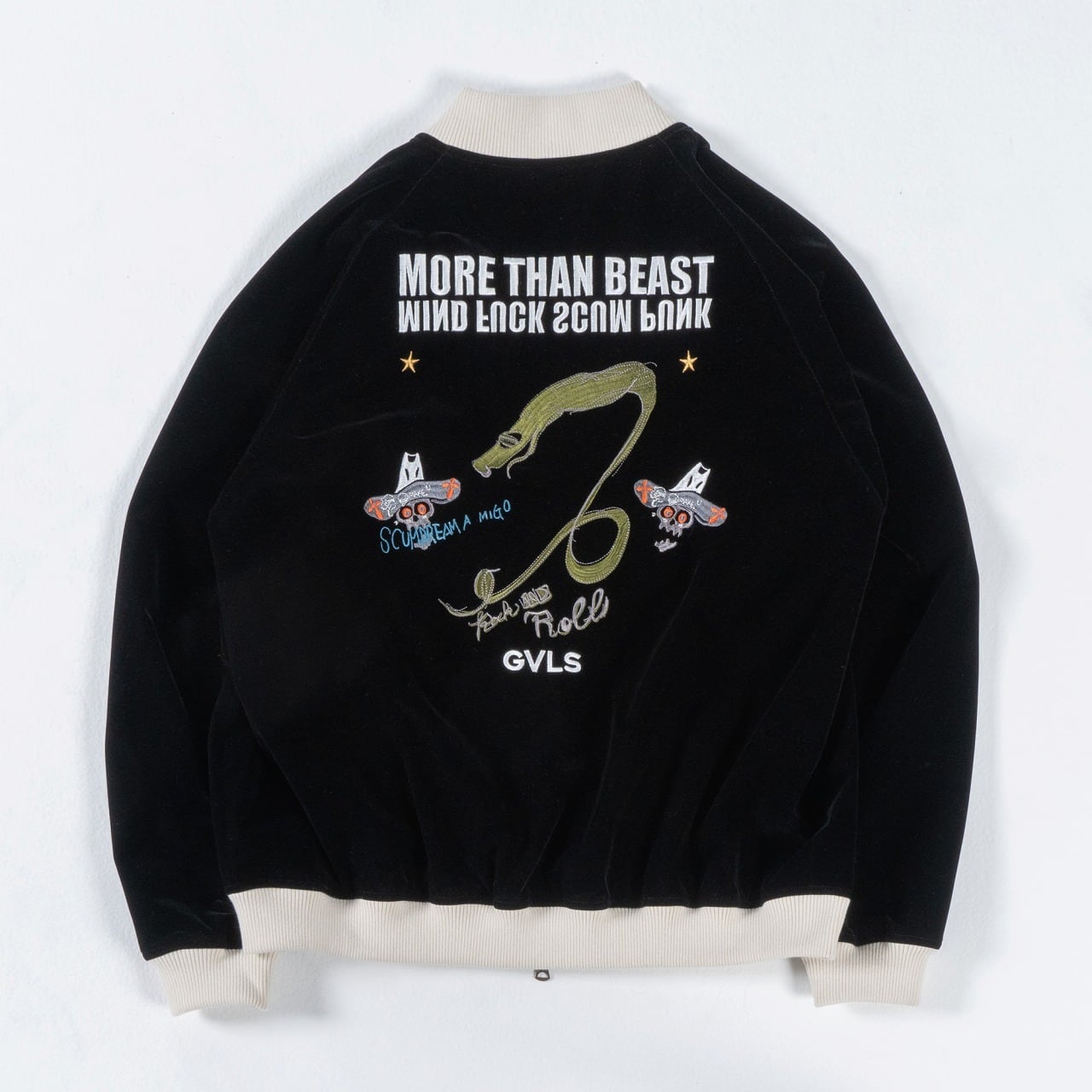 中村達也氏が2025年に自らを表現するワードとして掲げた2WILD FUCK PUNK SKUM"の文字と、GVLS2025AWのイラストレーションとして描いた数々のイラストを刺繍で表現したベルベット製のブルゾン。着丈を腰のラインまでに合わせ、すっきりしたトップスとし、深い色味で際立たせた。