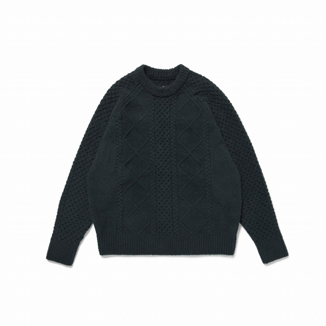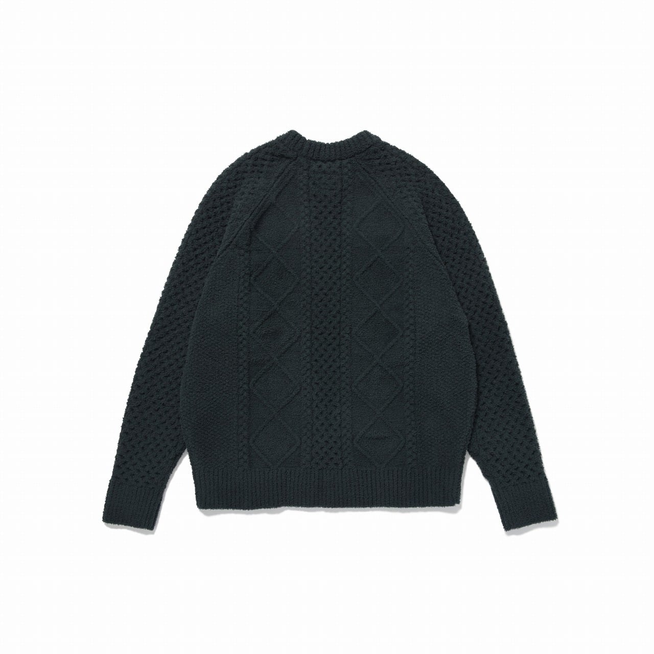 重くて硬いフィッシャーマンニットを軽くてソフトなシャギーヤーン糸でケーブル編みを表現したMAGIC NUMBERらしい1着。毛足が長くソフトな肌触りで柔らかく保温性が高くキックバックが強いシャギーヤーンニット。肩幅、身幅、袖幅にゆとりを持たせたシルエット。