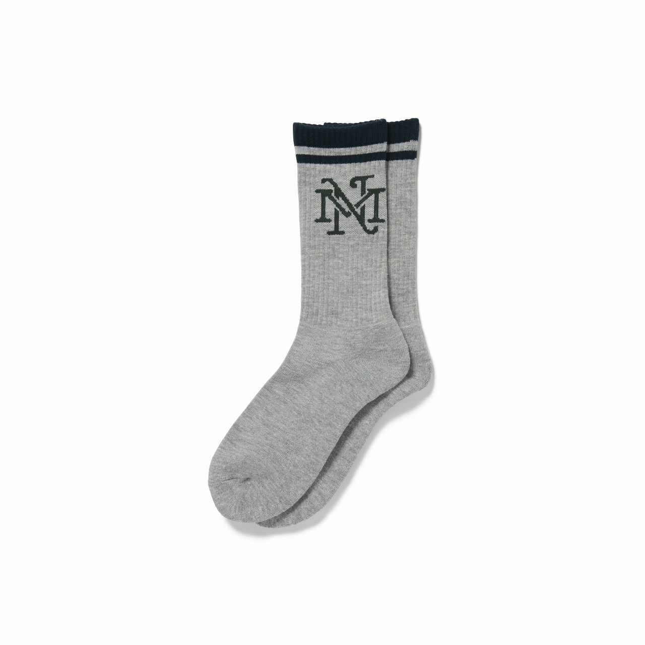 Handwriting Sign PainterのNUTS ART WORKSによるEMBLEMと配色ボーダーをジャガードで表現。1日の生産数が非常に少ない貴重なビンテージ織機によってゆっくり時間をかけ編みたてられたソックス。防菌/防臭