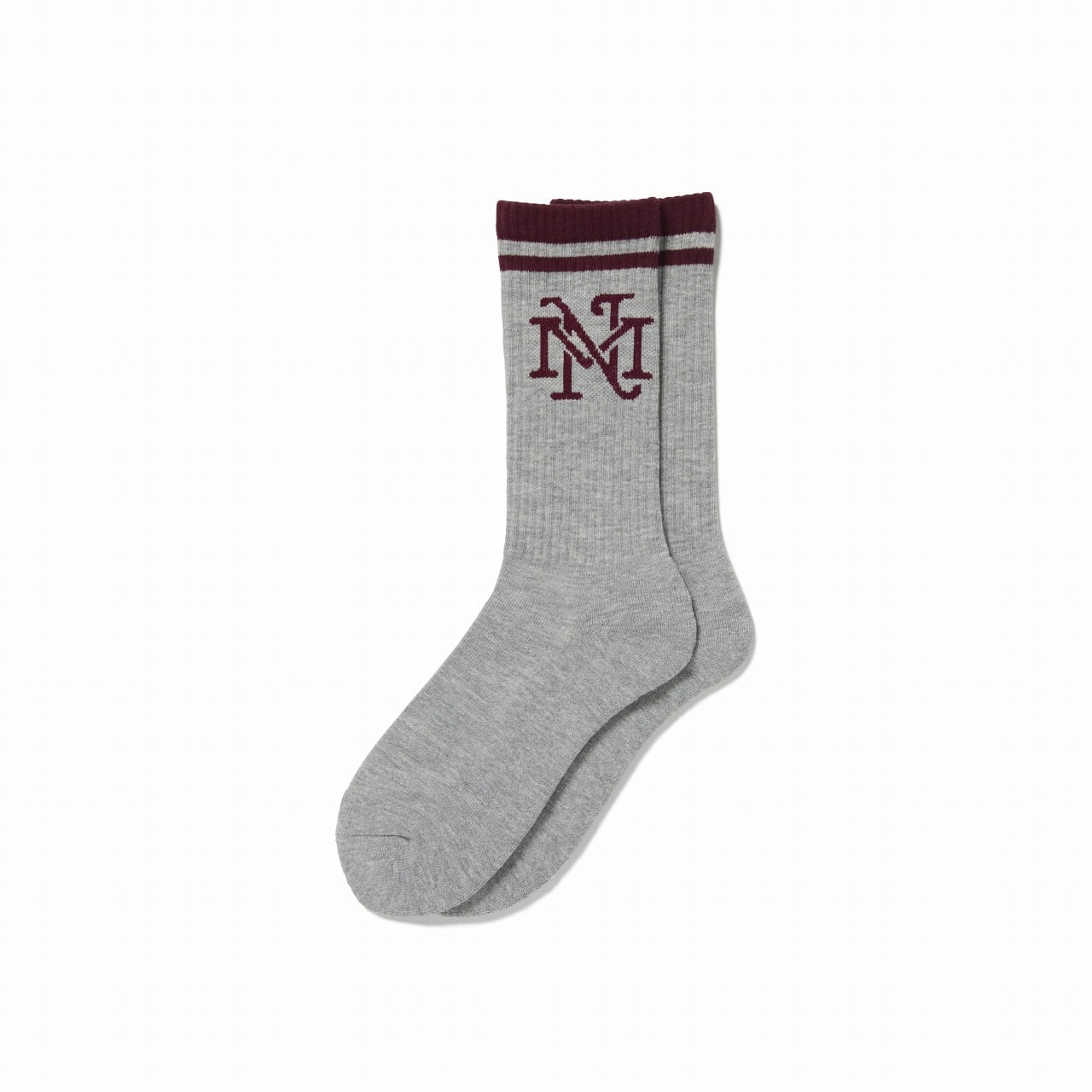 Handwriting Sign PainterのNUTS ART WORKSによるEMBLEMと配色ボーダーをジャガードで表現。1日の生産数が非常に少ない貴重なビンテージ織機によってゆっくり時間をかけ編みたてられたソックス。防菌/防臭