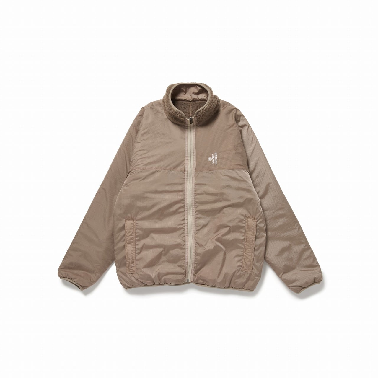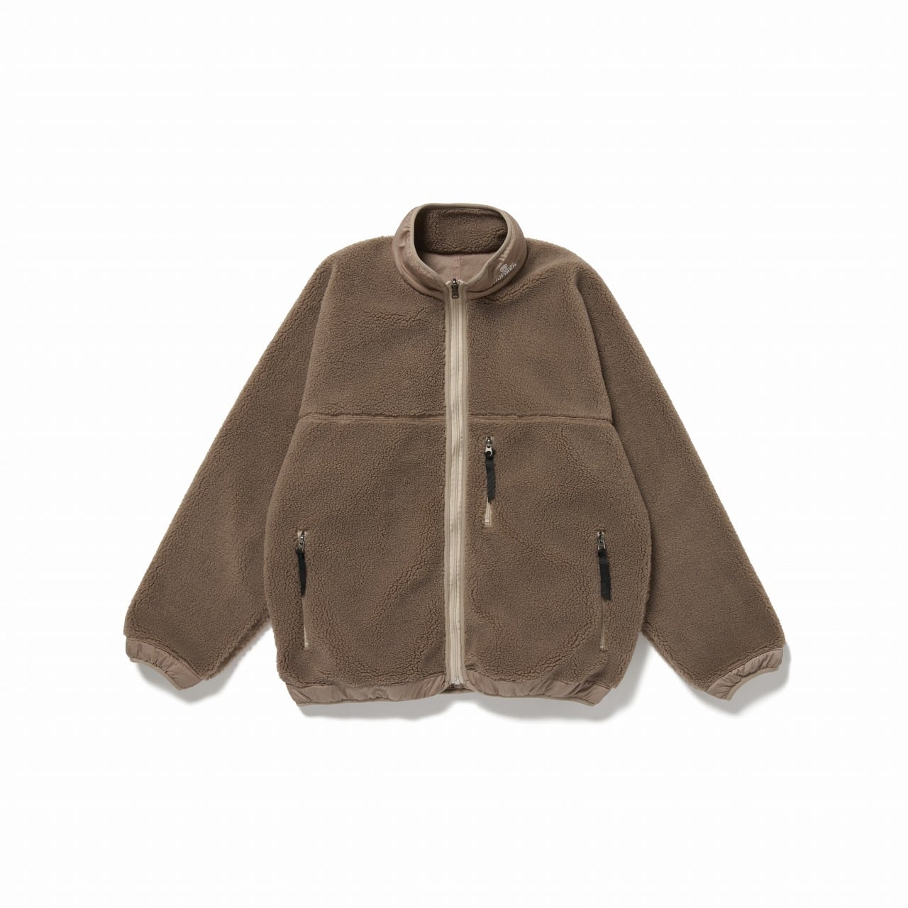 風の侵入に強いナイロンとボアのリバーシブルジャケット。首回りの保湿を考慮し、内側にボア、外側にナイロンを配置したスタンドカラー。肩に極力ストレスをかけないよう、出来るだけ平行に取った肩下がりと可動域が広いスプリットヨーク。摩擦からボアを守るナイロンリップストリップ素材を袖口に配置。肩幅、身幅、袖幅にゆとりを持たせたシルエット。