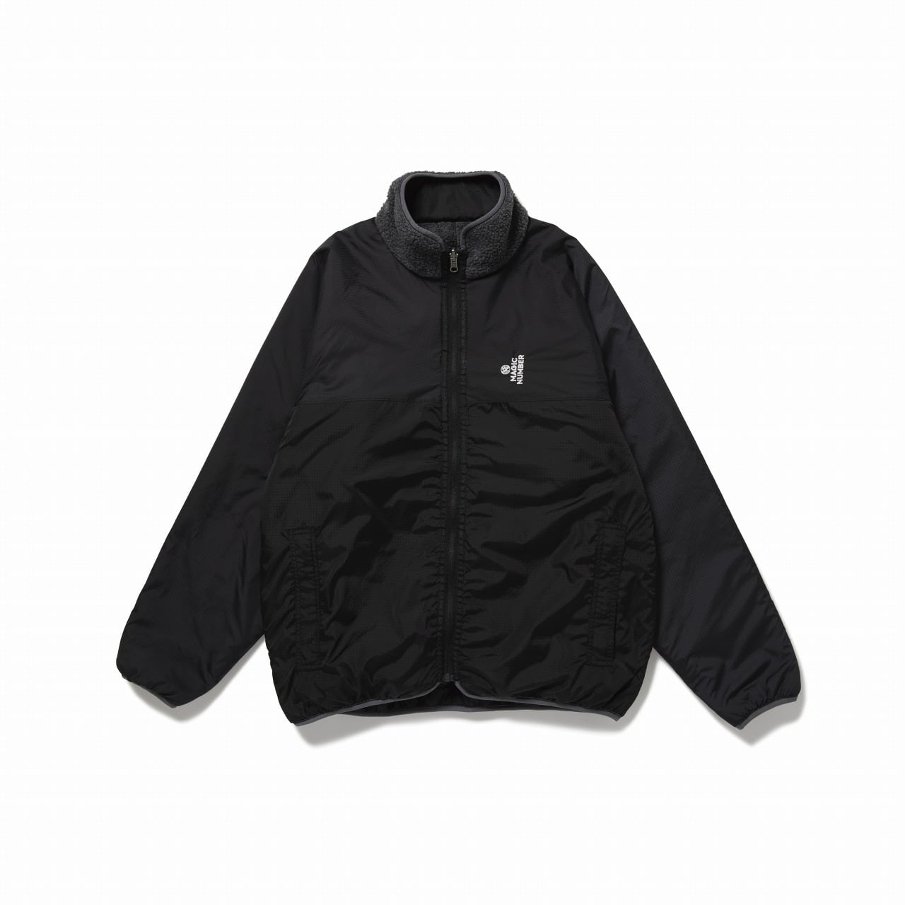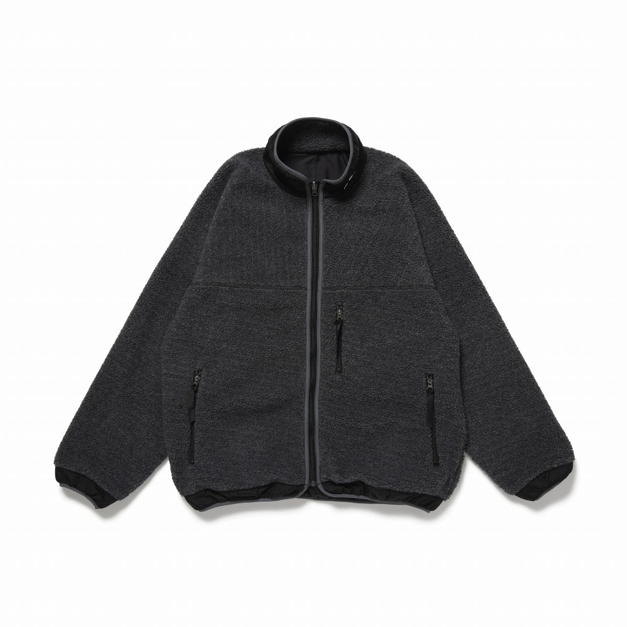 風の侵入に強いナイロンとボアのリバーシブルジャケット。首回りの保湿を考慮し、内側にボア、外側にナイロンを配置したスタンドカラー。肩に極力ストレスをかけないよう、出来るだけ平行に取った肩下がりと可動域が広いスプリットヨーク。摩擦からボアを守るナイロンリップストリップ素材を袖口に配置。肩幅、身幅、袖幅にゆとりを持たせたシルエット。