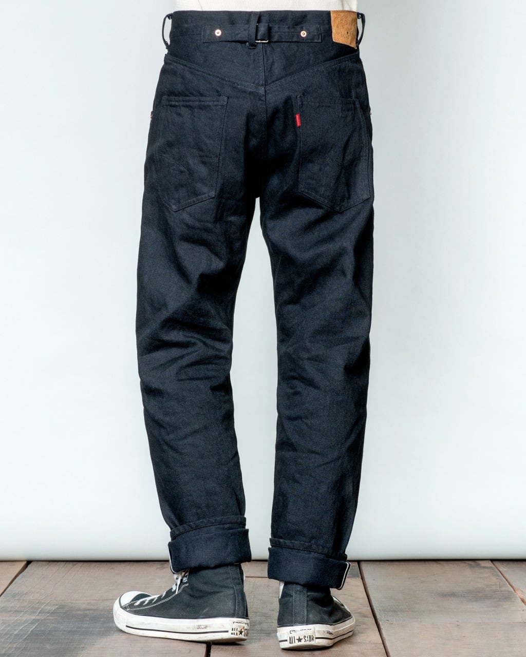 タテヨコ共に硫化ブラックを使用して製作したデニム生地。硫化なのでインディゴ同様に履き込んだ時に色落ちも楽しめます。リーバイス66前期の製品をイメージした生地感です。昔ながらの日本の力織機で織られる、特有の凹凸のある素朴な風合が、古き良き時代のビンテージ感を再現してくれる。