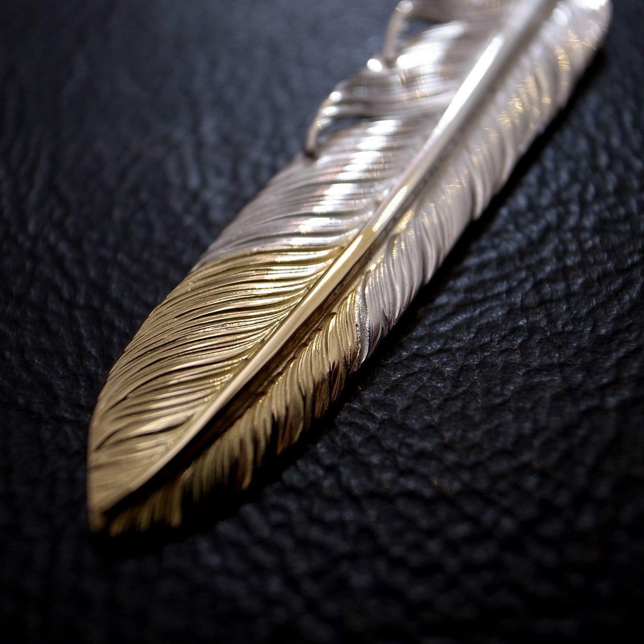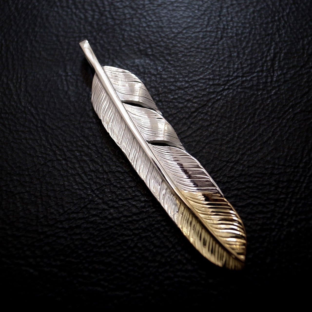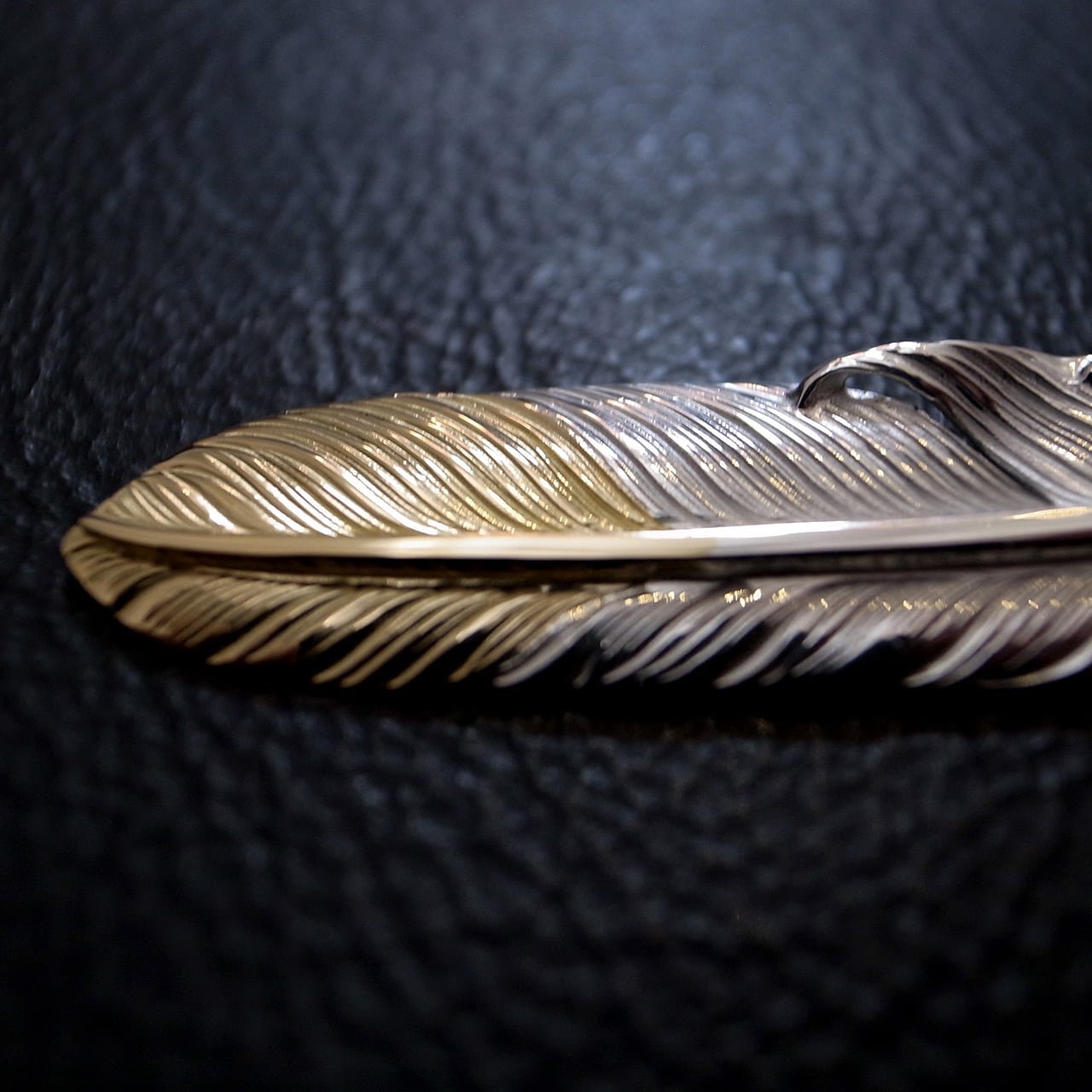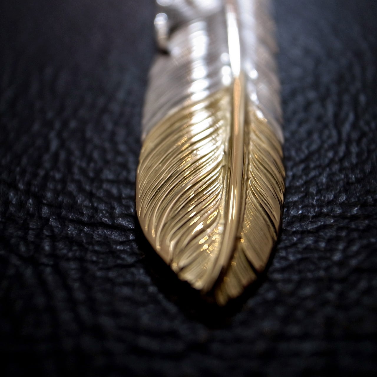 M サイズのフライトフェザー02をベースに羽先をK18 GOLDを配置した、TARO WASHIMIの彫金の美しさを感じるフェザー。数種あるフェザーの中でもシャープな印象のフライトフェザーは洗練された印象を持ちます。シルバーとゴールドのコントラストが魅力的です。