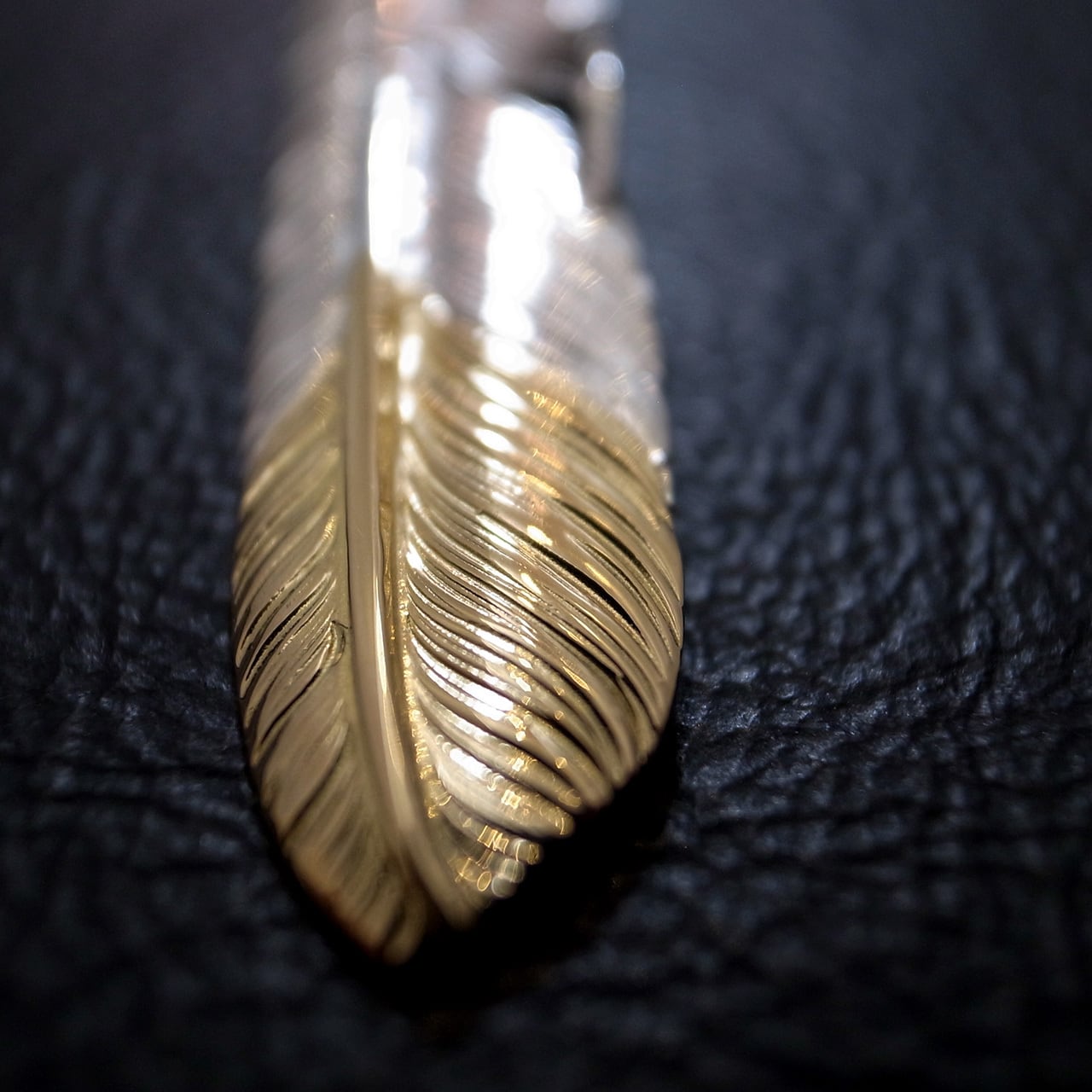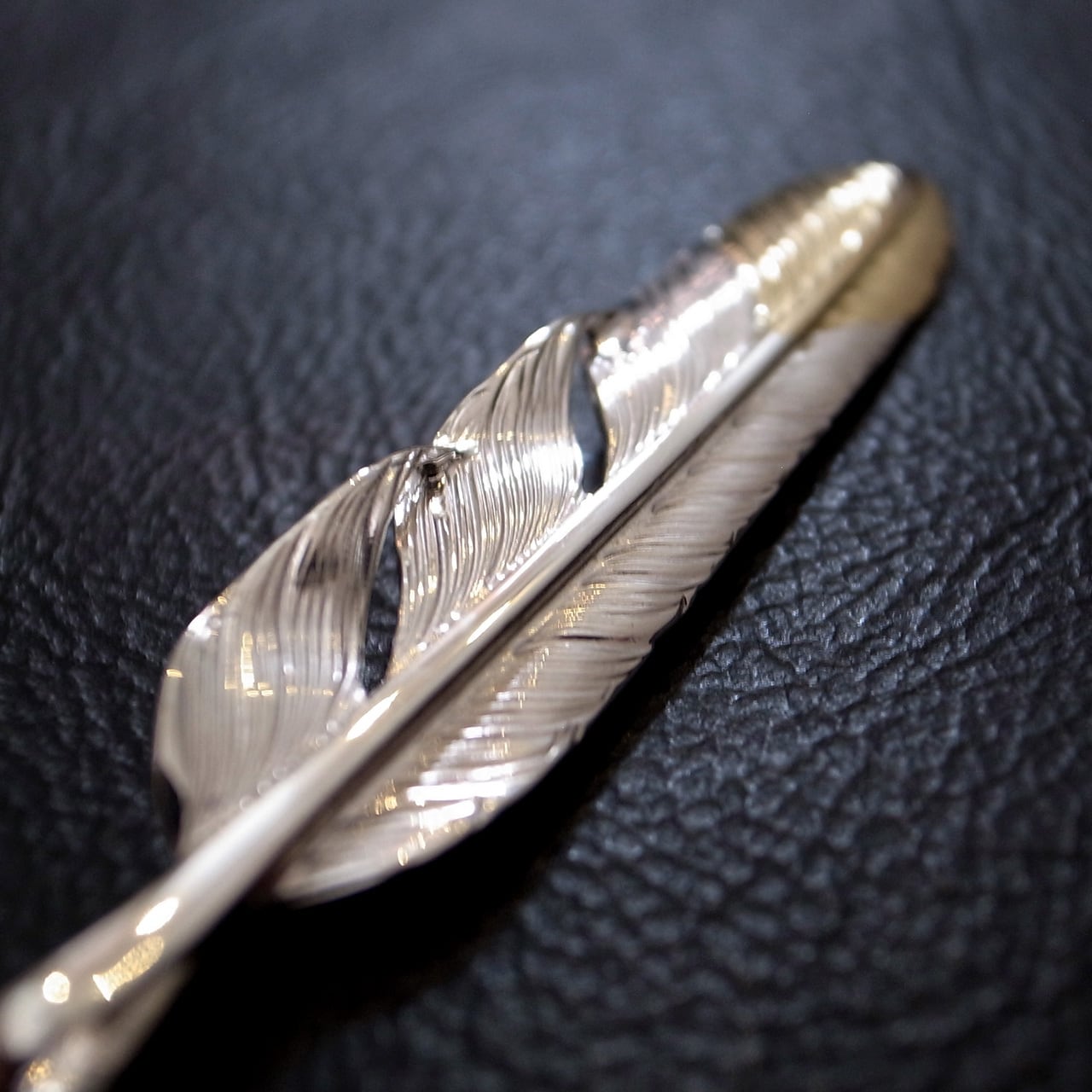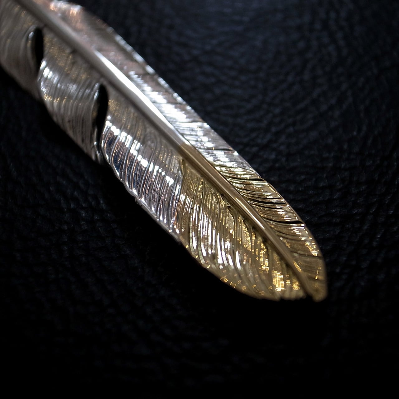 M サイズのフライトフェザー01をベースに羽先をK18 GOLDを配置した、TARO WASHIMIの彫金の美しさを感じるフェザー。数種あるフェザーの中でもシャープな印象のフライトフェザーは洗練された印象を持ちます。シルバーとゴールドのコントラストが魅力的です。