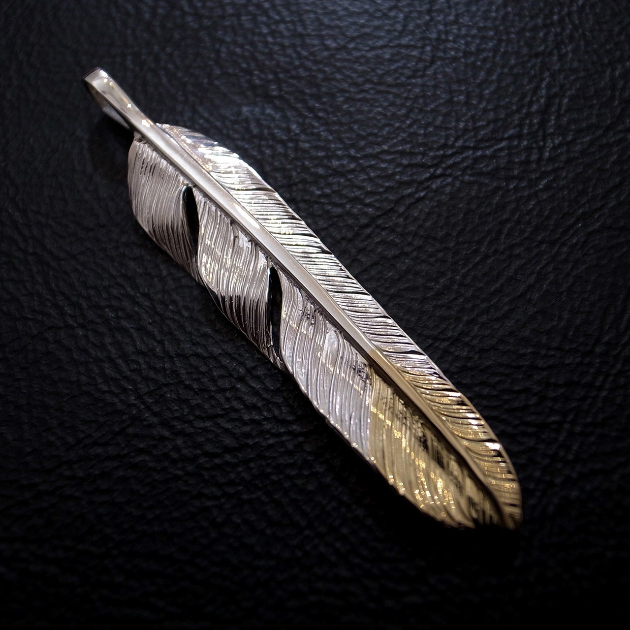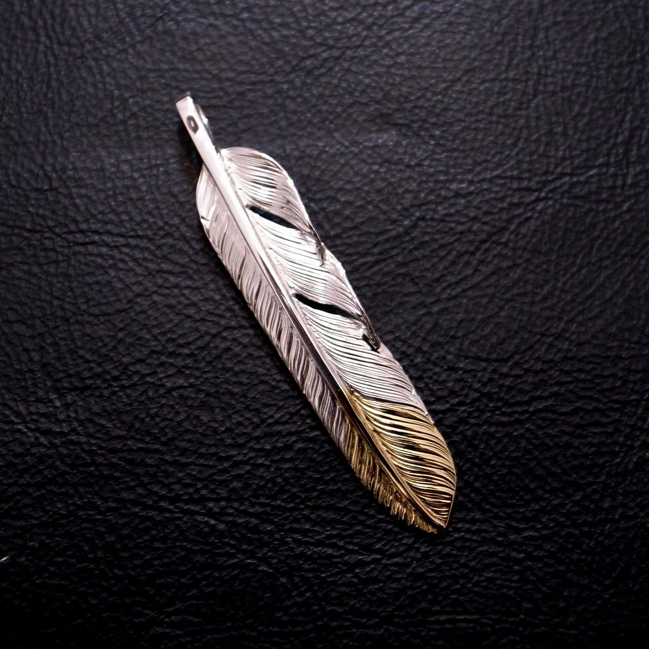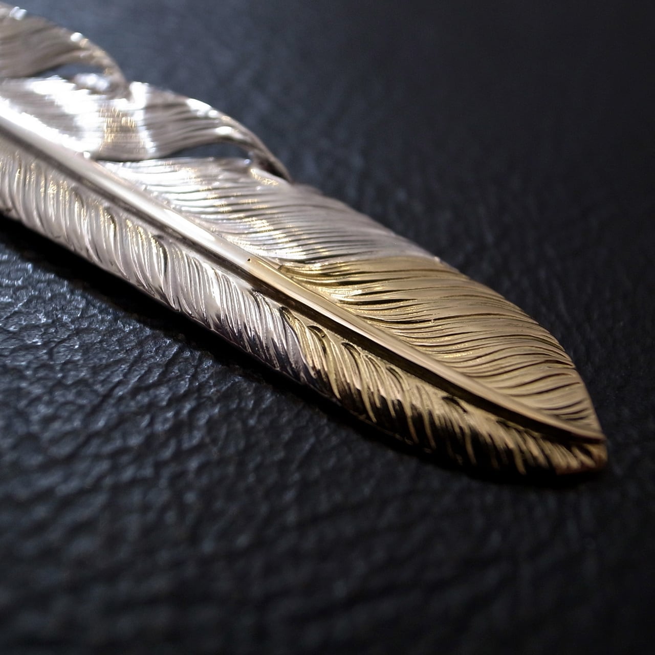 M サイズのフライトフェザー01をベースに羽先をK18 GOLDを配置した、TARO WASHIMIの彫金の美しさを感じるフェザー。数種あるフェザーの中でもシャープな印象のフライトフェザーは洗練された印象を持ちます。シルバーとゴールドのコントラストが魅力的です。