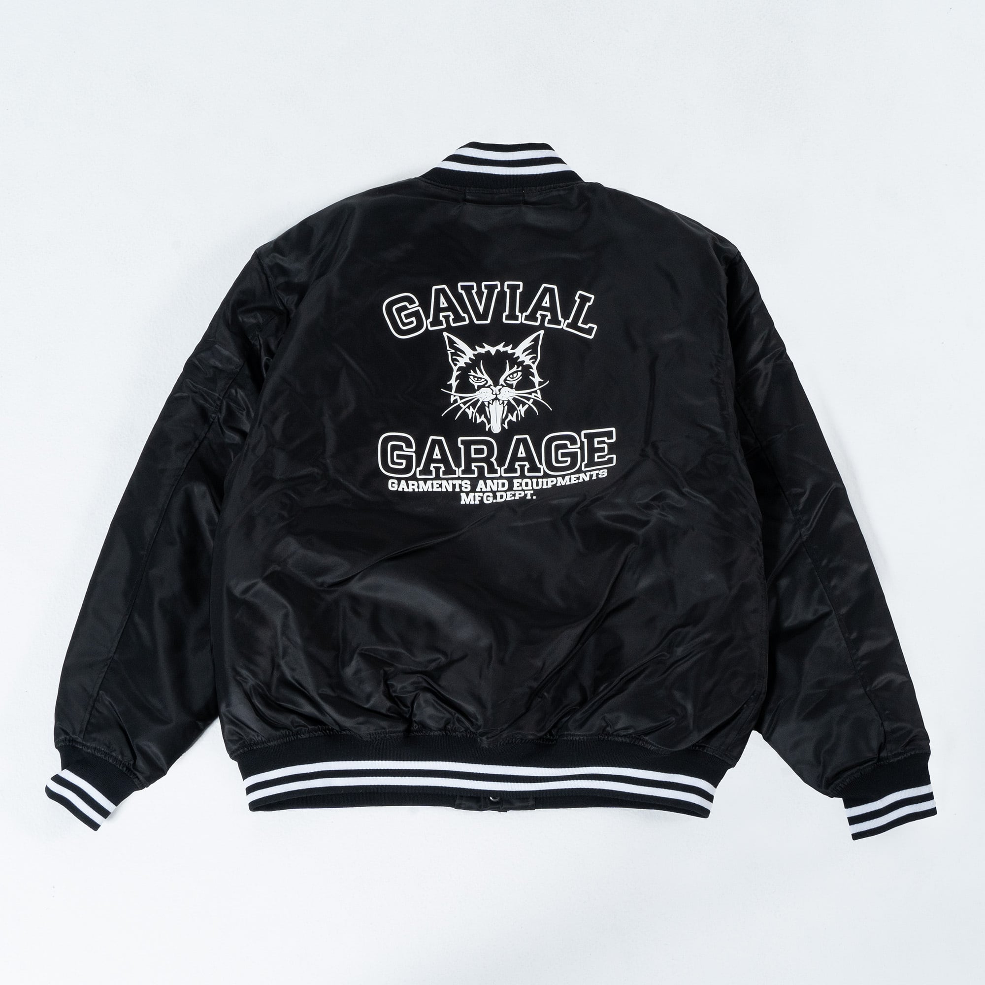 使い勝手の良いナイロン素材のスタジアムジャケット。リラックス感を持たせたバルーンシルエットです。GAVIAL GARAGE カレッジロゴのグラフィックをプリント。