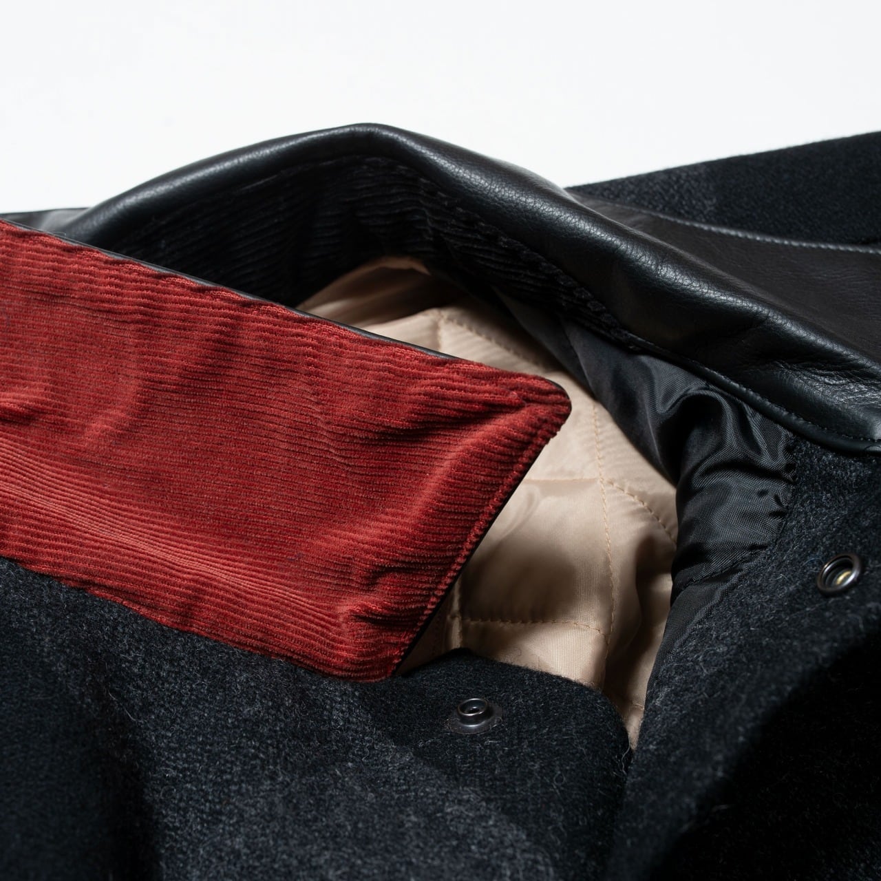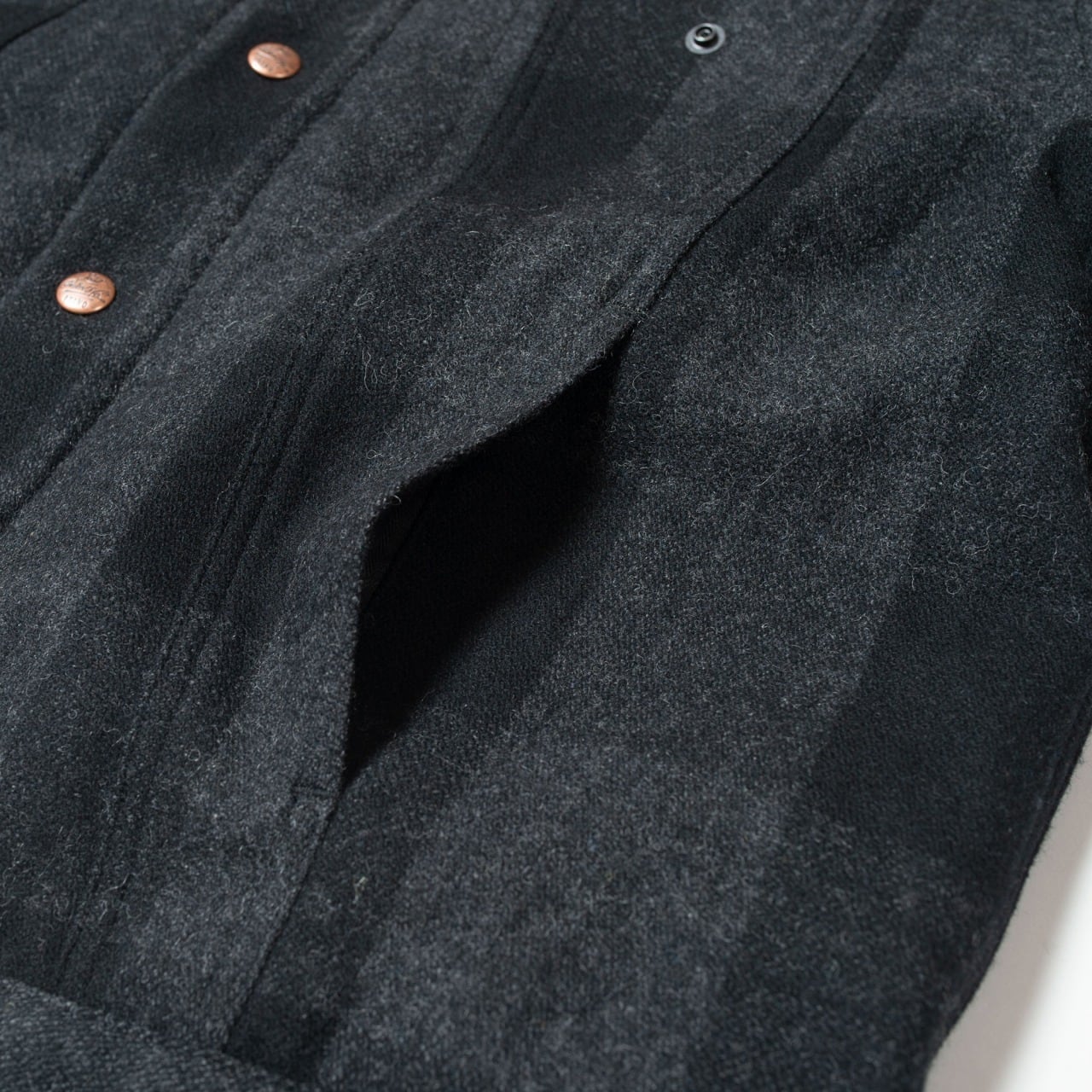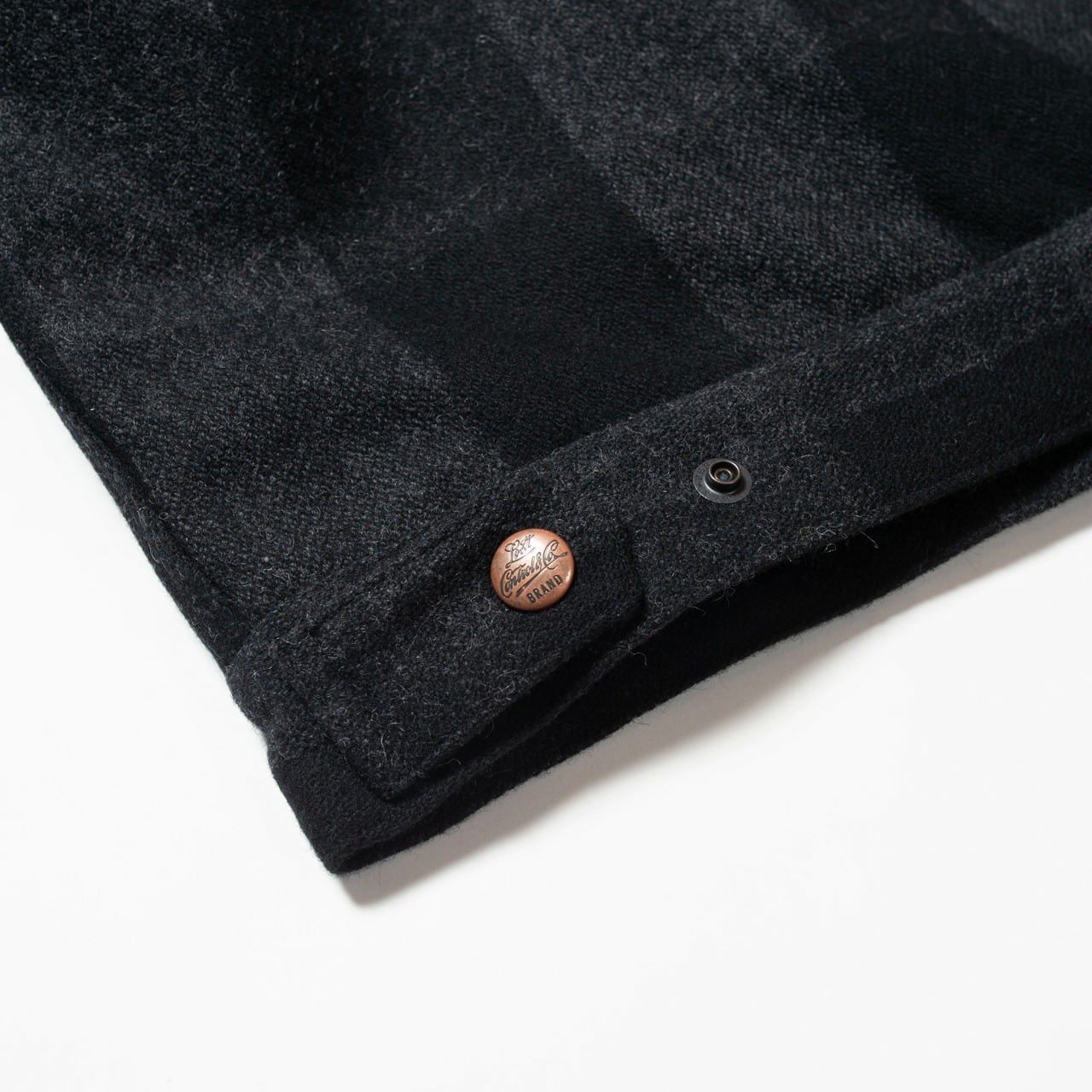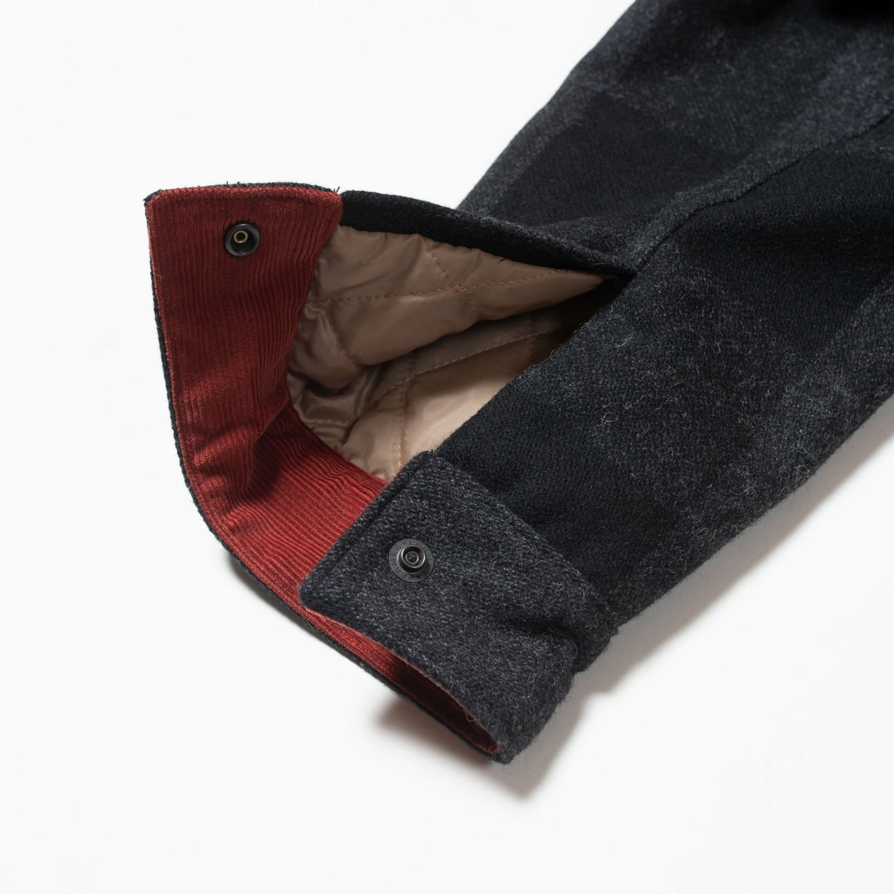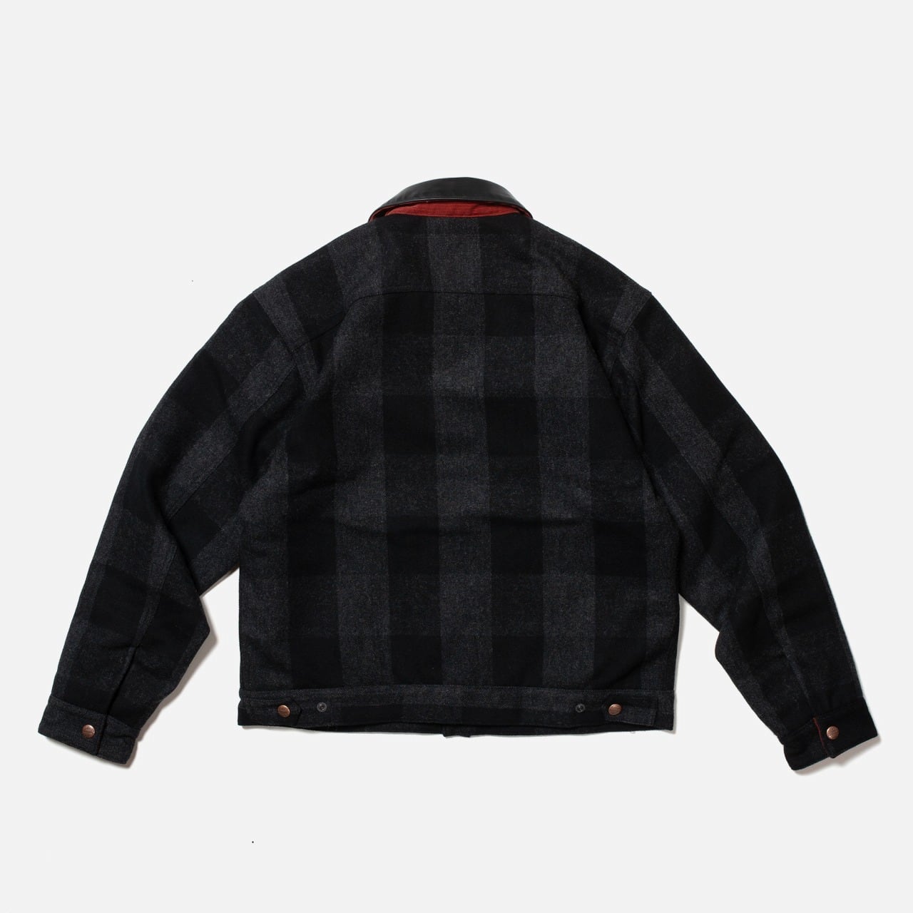 大きなバッファローチェックが印象的なトラッカージャケット。表地には保温性・柔軟性に優れたドライタッチなウールメルトン素材。裏地はフロントとバックが配色かつ異なるキルティングパターンで構成しています。中綿を内蔵しているので、保温性を高めています。トラッカージャケットの伝統的なシルエットをリスペクトしつつ、オリジナリティのあるバランスに構築してあります。
