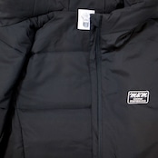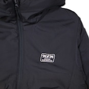 シンプルなデザインで汎用性の高い中綿入りフードパーカー。軽やかな高密度タフタ生地を使用。表地はアクリルコーティングでハリを出し、裏地は素肌に優しい仕様。チンガード付きのフロントジップは、上まで閉めるとハイネックになります。YKK製ダブルジップを採用し、左胸にはロゴ刺繍入りです。