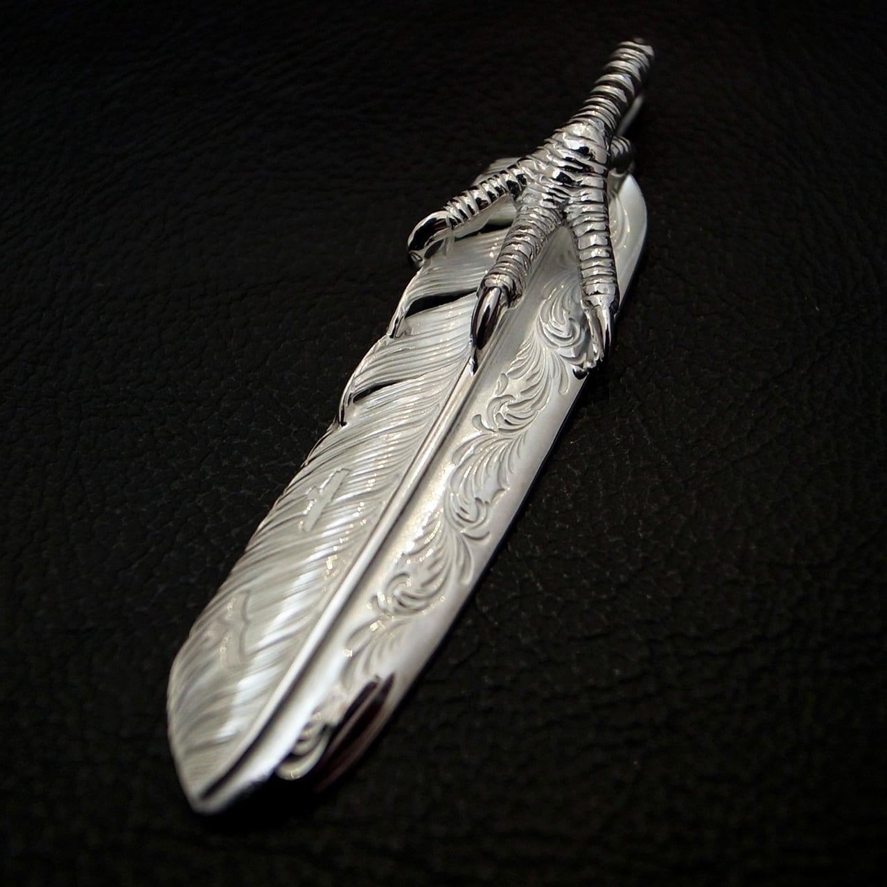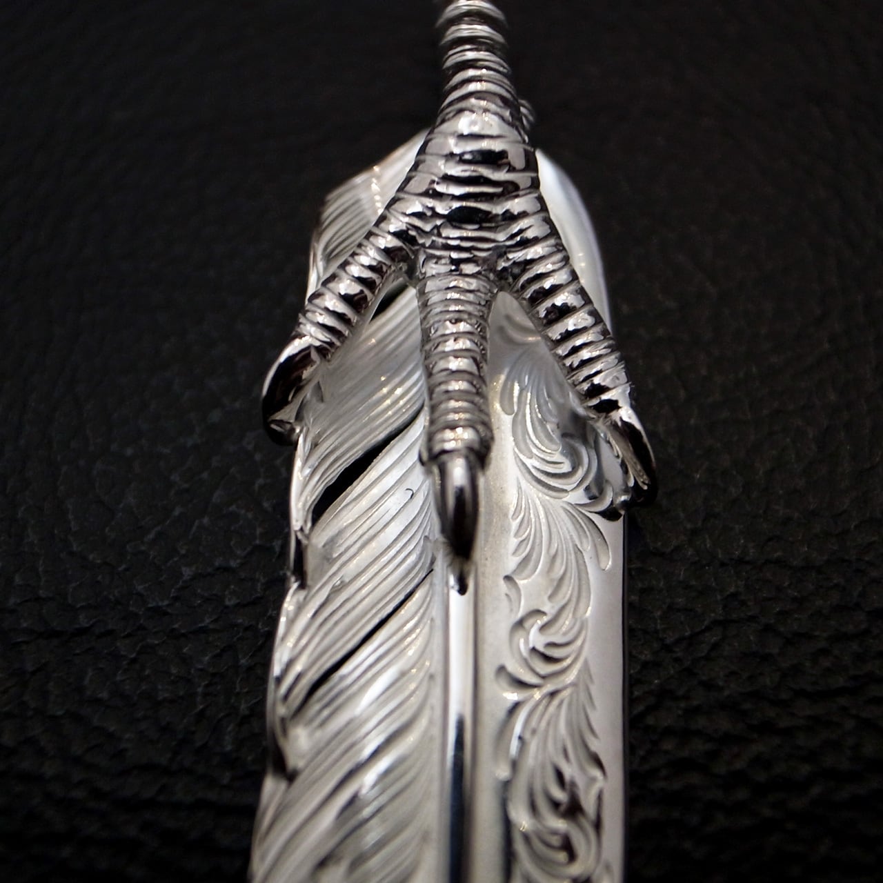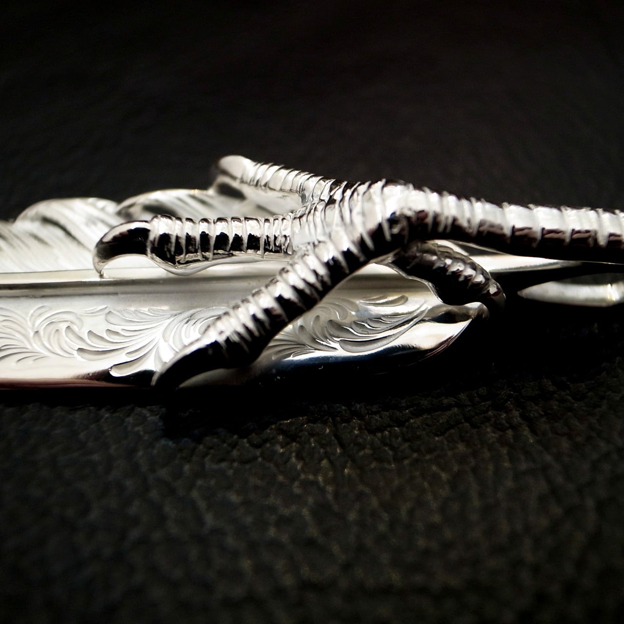 アラベスク彫りが施された、L サイズのフライトフェザー02をベースに、イーグルクローを配置した美しさとインパクトを兼ね備えた一枚。美しい彫金と細やかな作り込みが魅力的です。