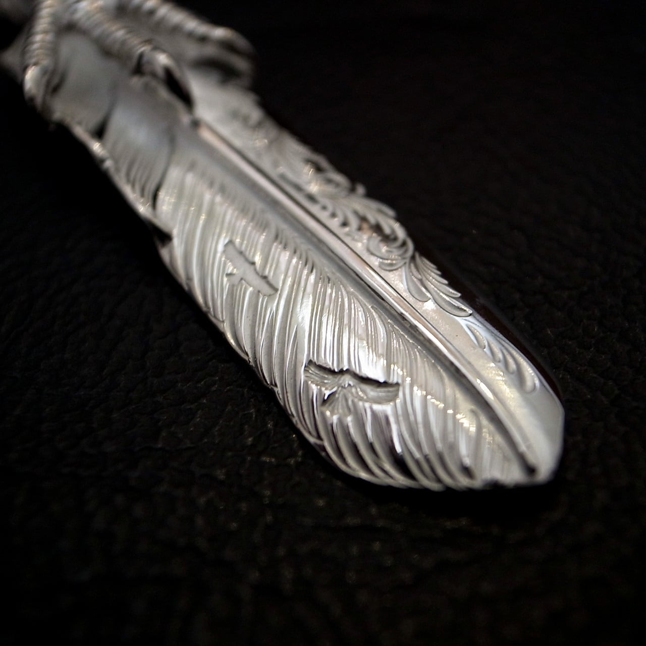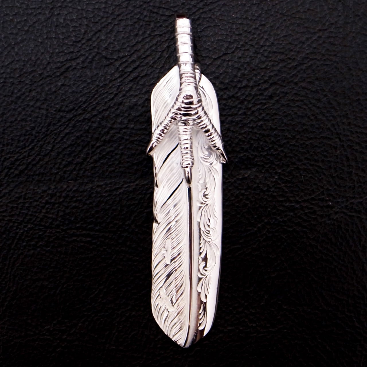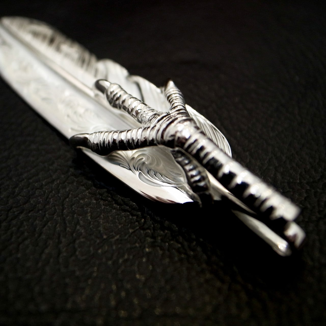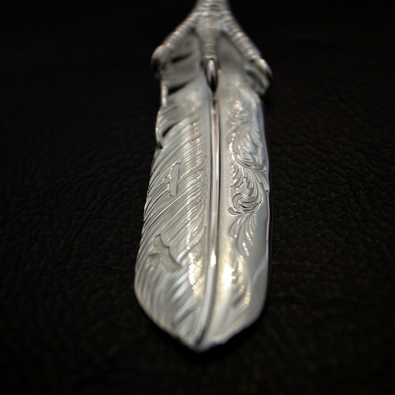 アラベスク彫りが施された、L サイズのフライトフェザー02をベースに、イーグルクローを配置した美しさとインパクトを兼ね備えた一枚。美しい彫金と細やかな作り込みが魅力的です。