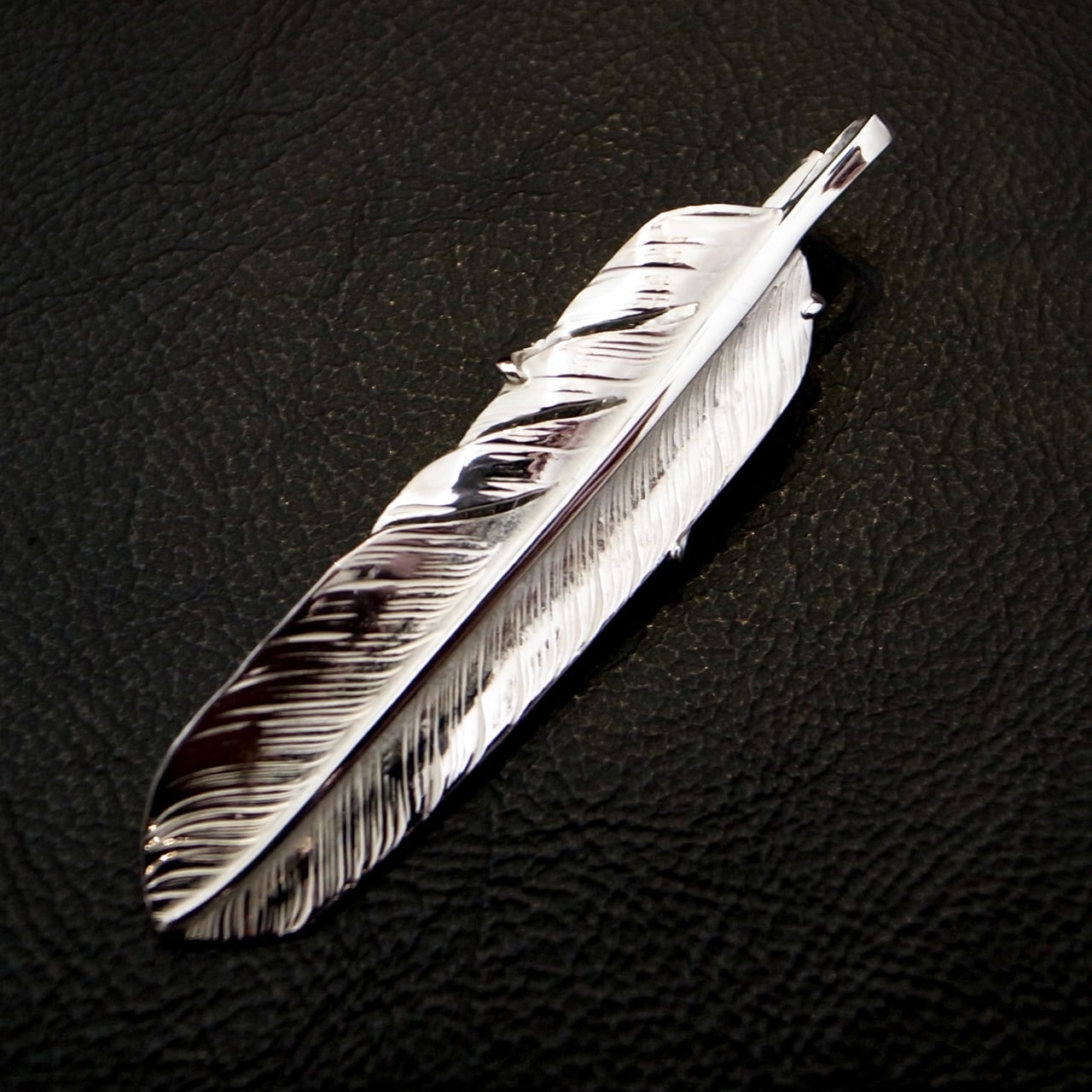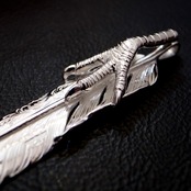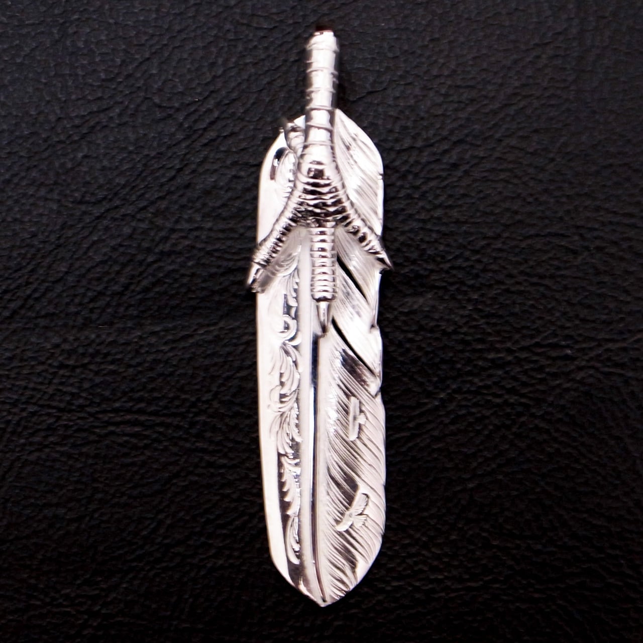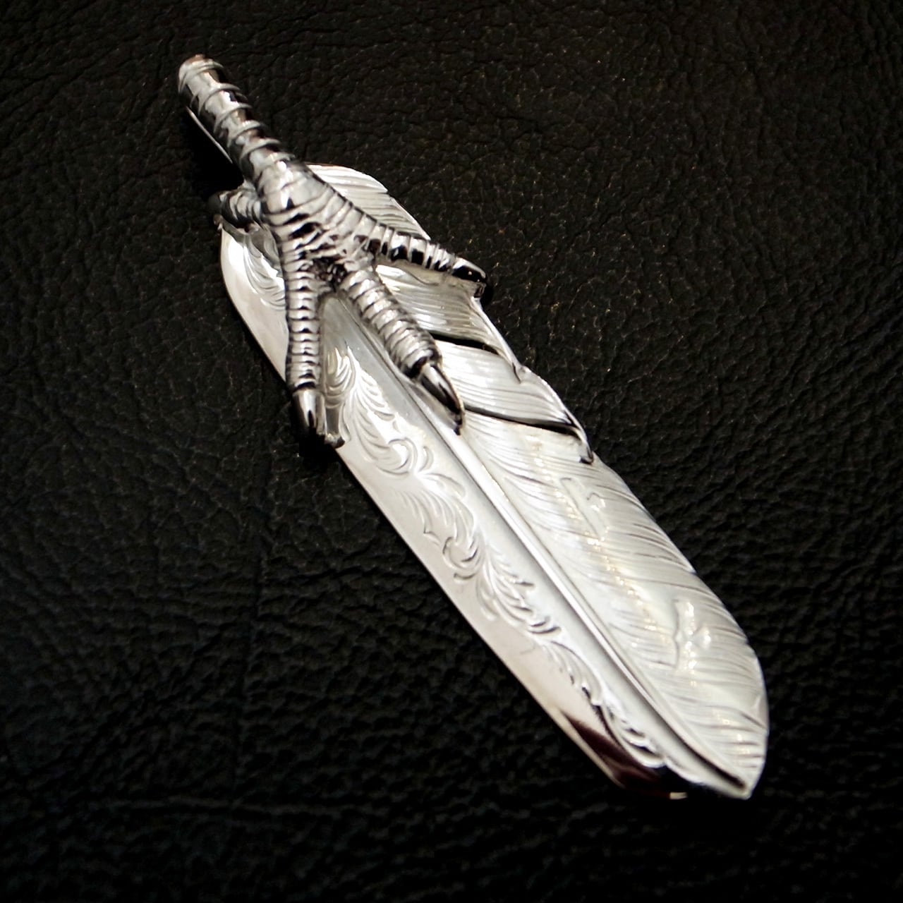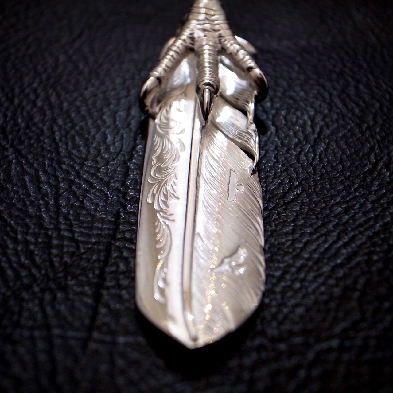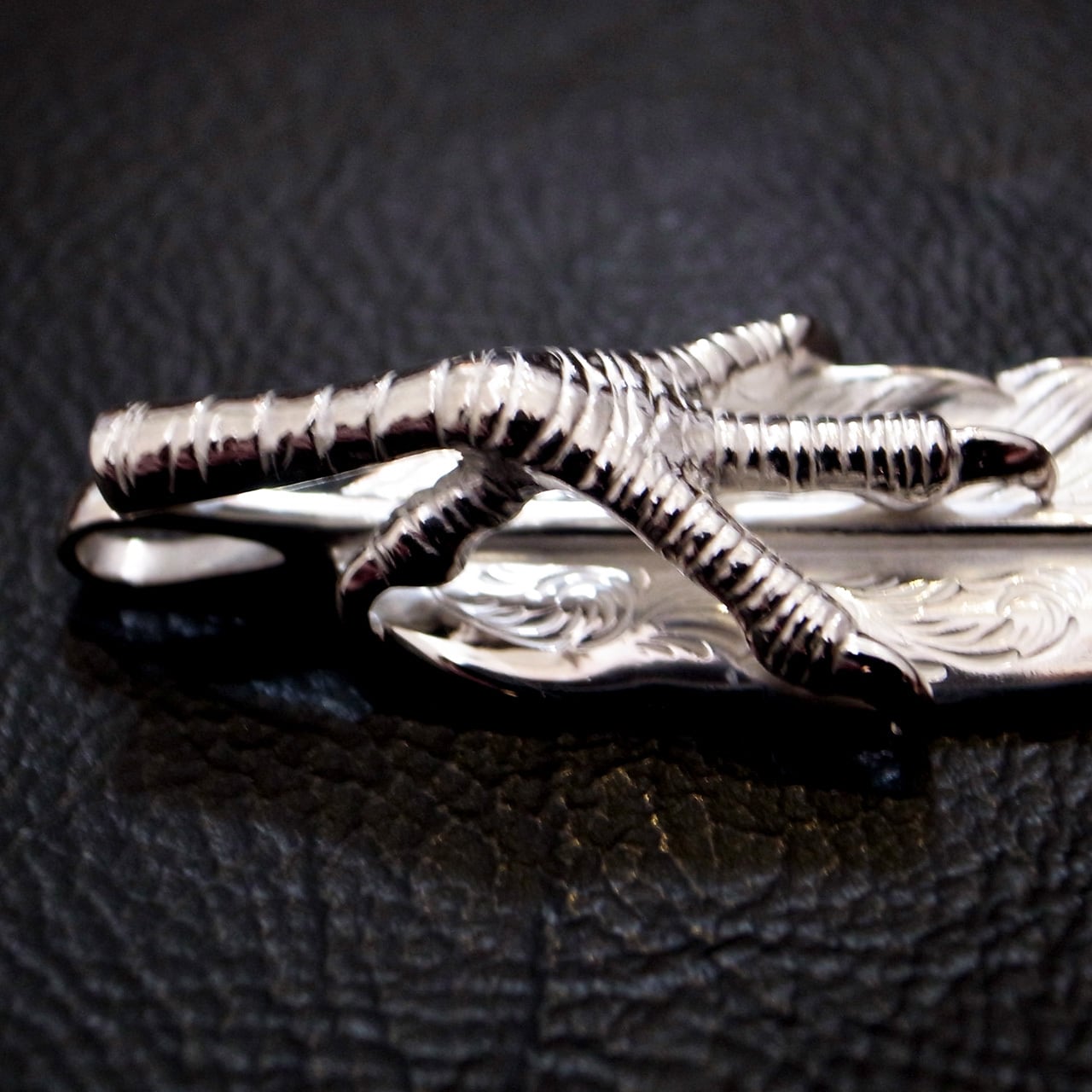 アラベスク彫りが施された、L サイズのフライトフェザー02をベースに、イーグルクローを配置した美しさとインパクトを兼ね備えた一枚。美しい彫金と細やかな作り込みが魅力的です。