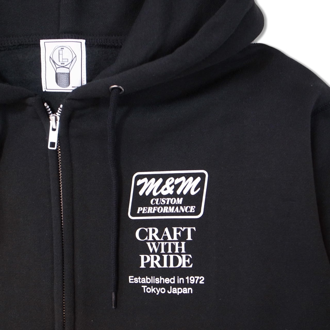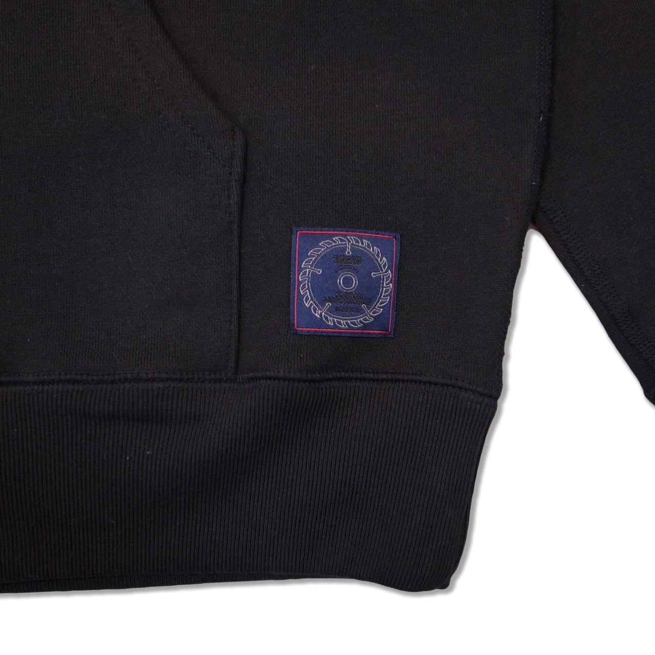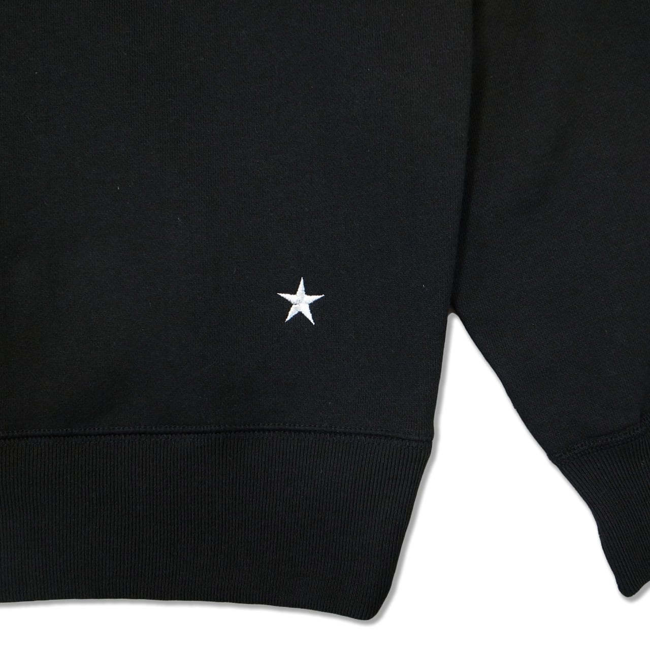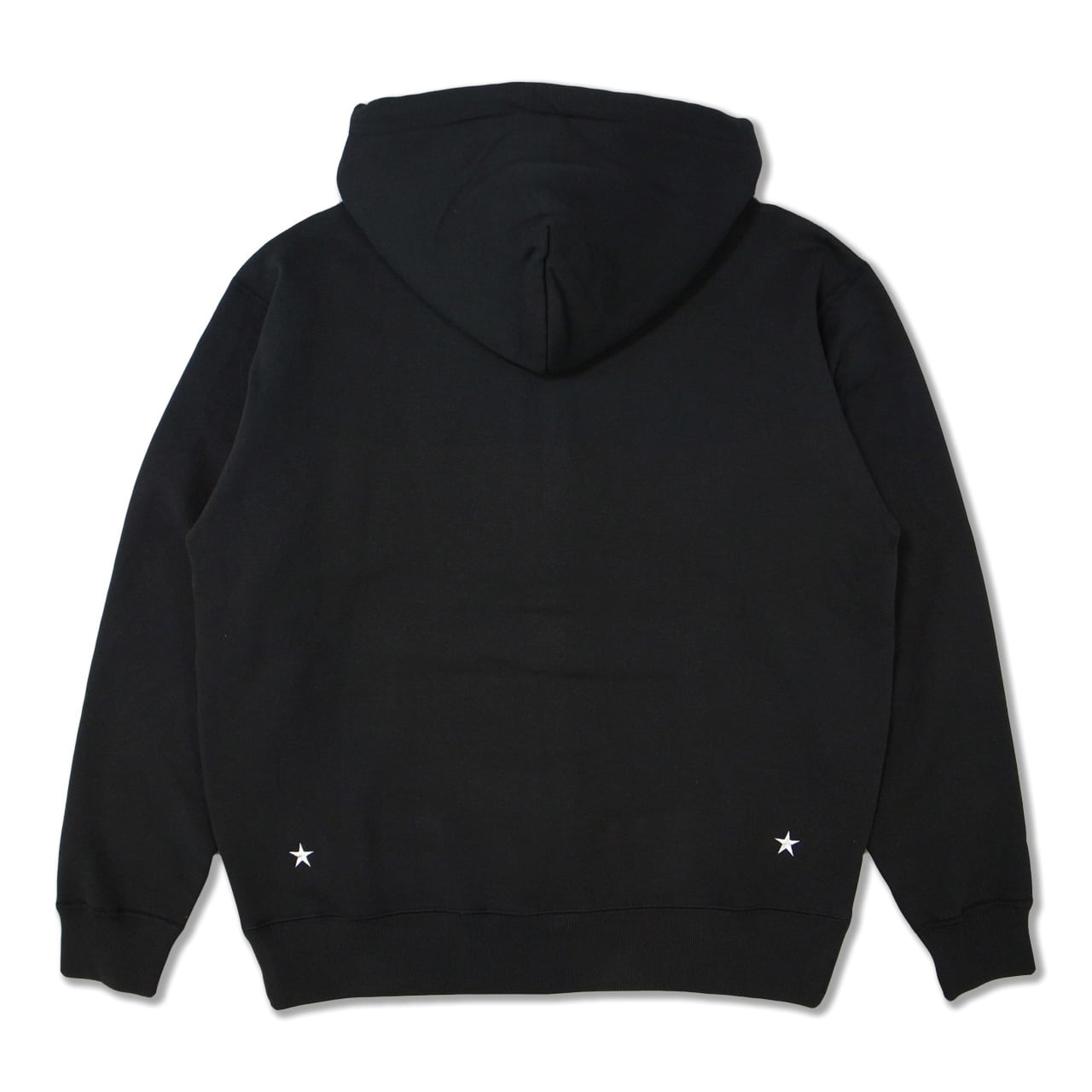極厚12.4ozのタフなボディを使用したジップアップフーディ。裏起毛で保温性の高いアイテム。フロントにロゴプリント、背面裾に★刺繍を配置しています。