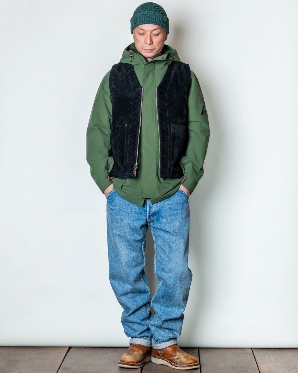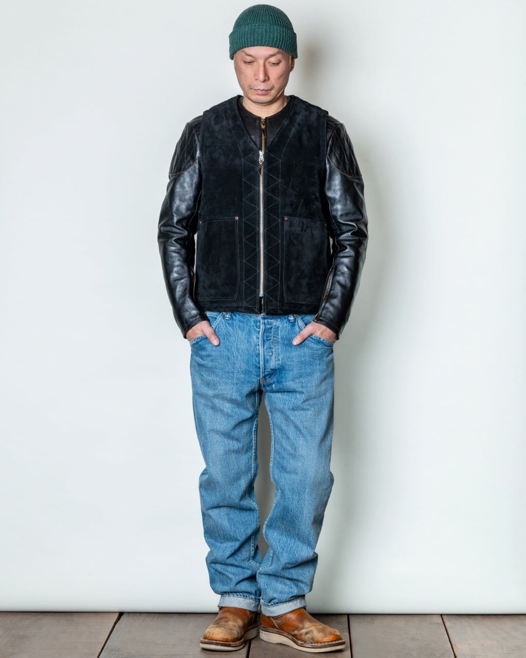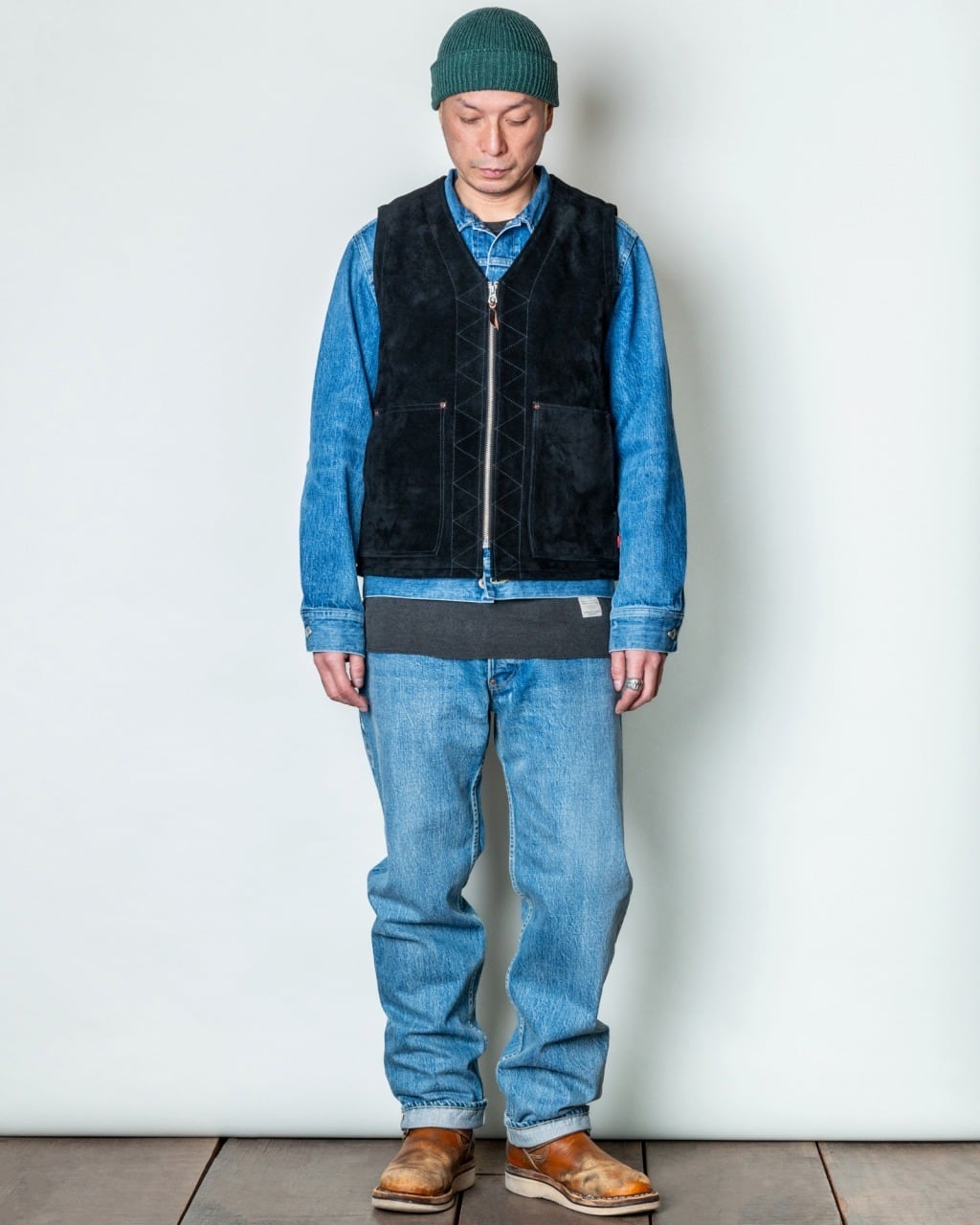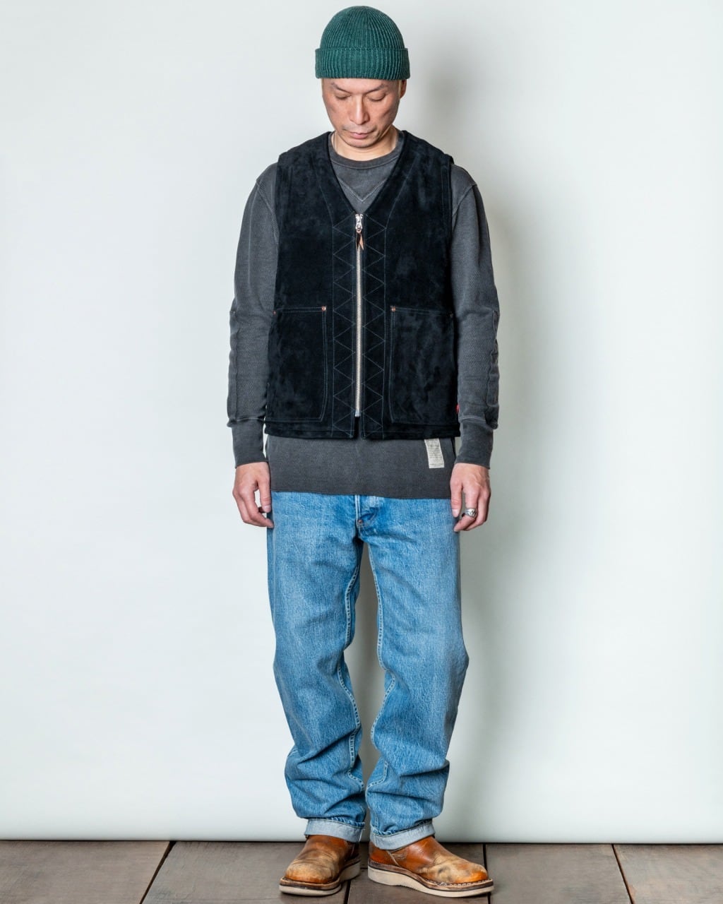 複合ダブルポケットを備えたシンプルな構造のジップスウェードベスト。表地には、1.2mm厚のホースハイドを使用しています。ホースハイドスウェードは味わいと共に長年にわたり着用できる魅力が在ります。