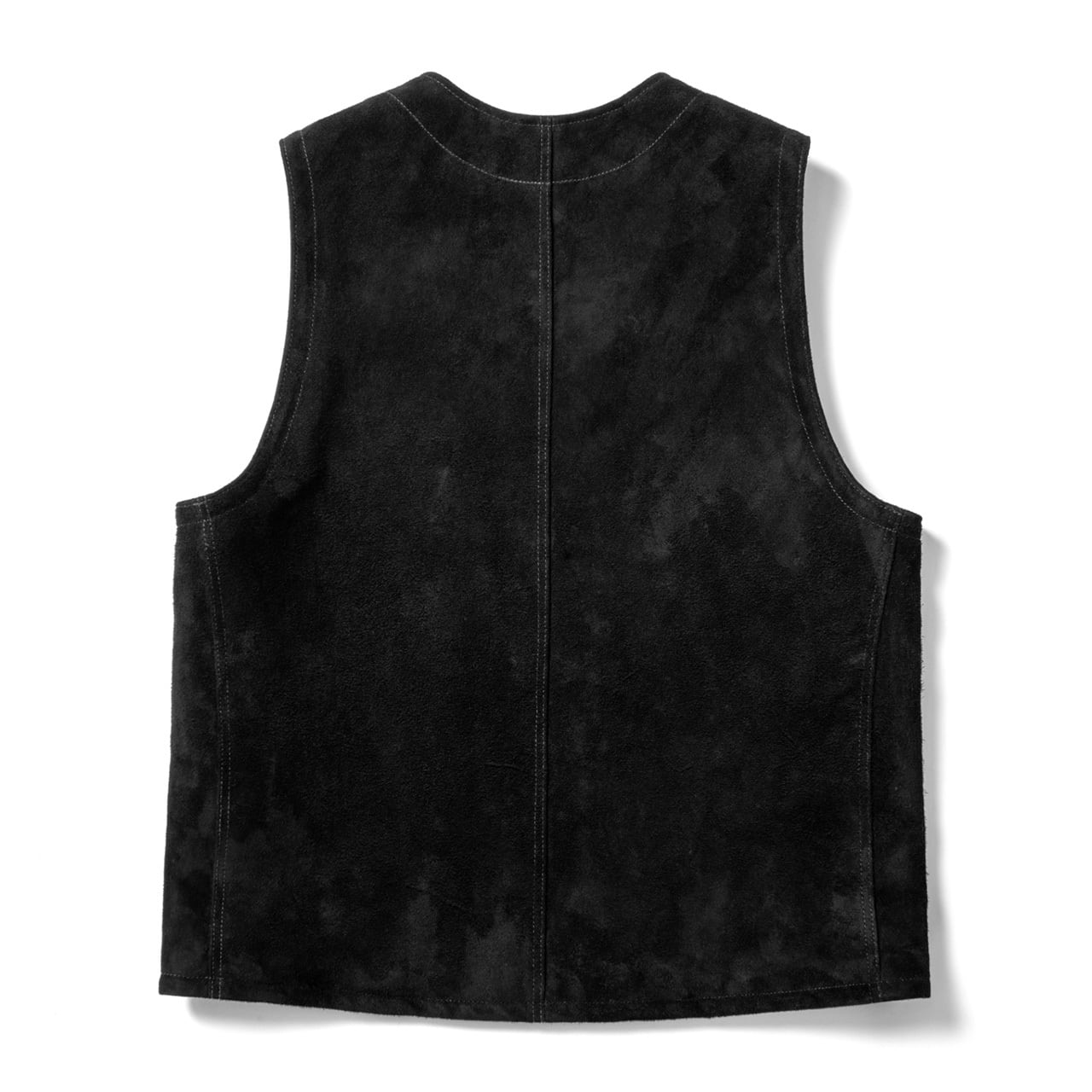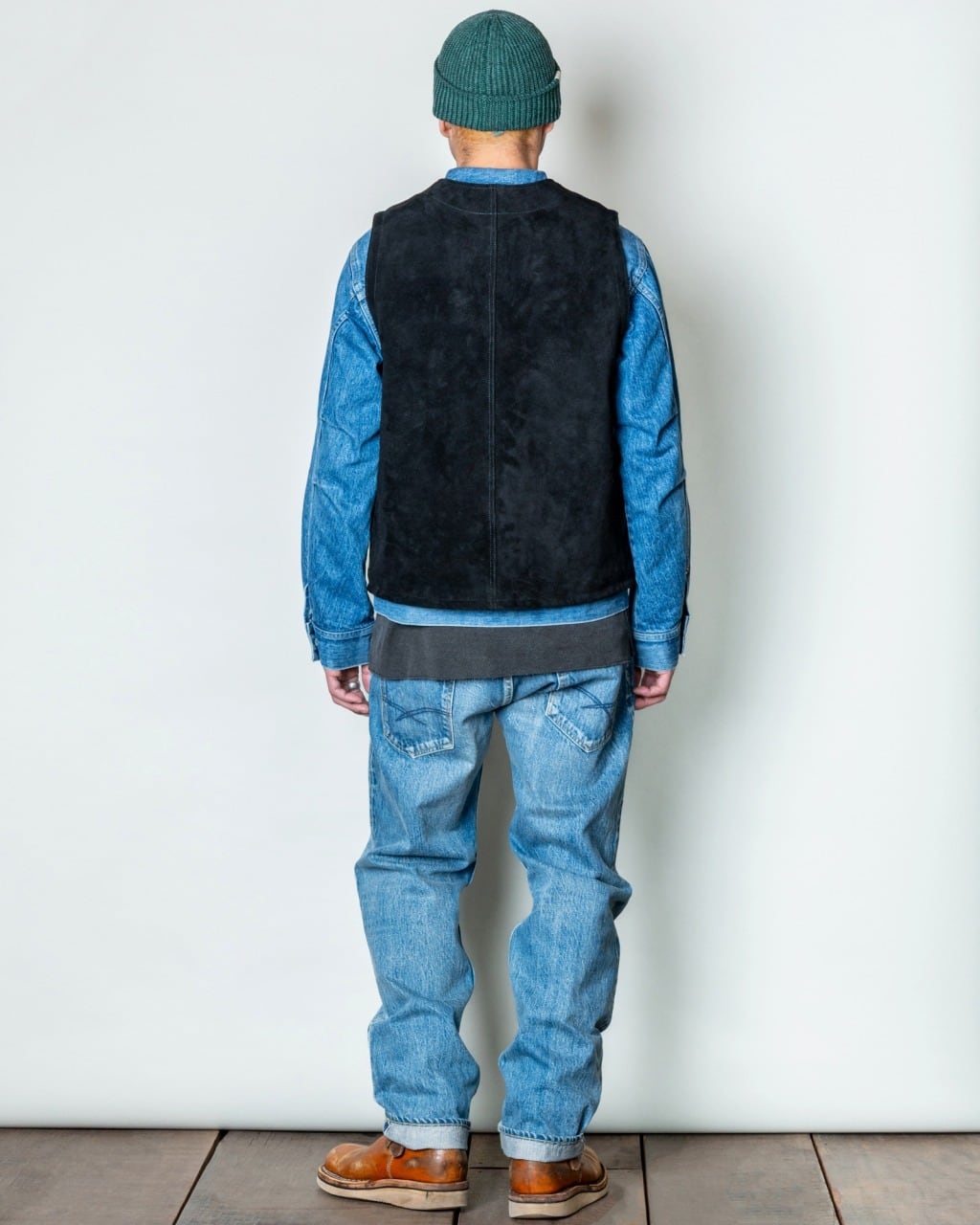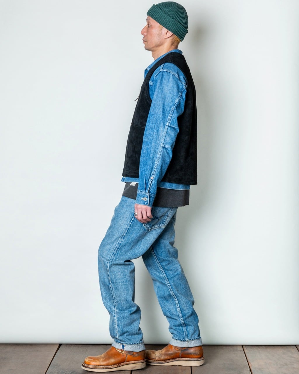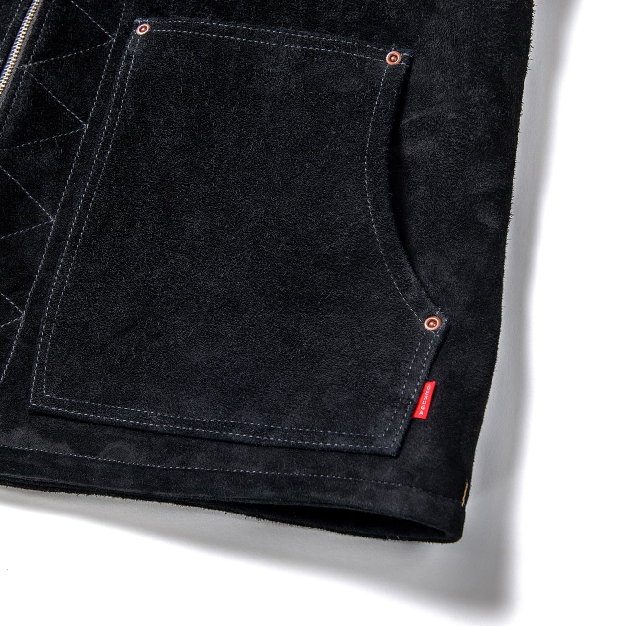 複合ダブルポケットを備えたシンプルな構造のジップスウェードベスト。表地には、1.2mm厚のホースハイドを使用しています。ホースハイドスウェードは味わいと共に長年にわたり着用できる魅力が在ります。
