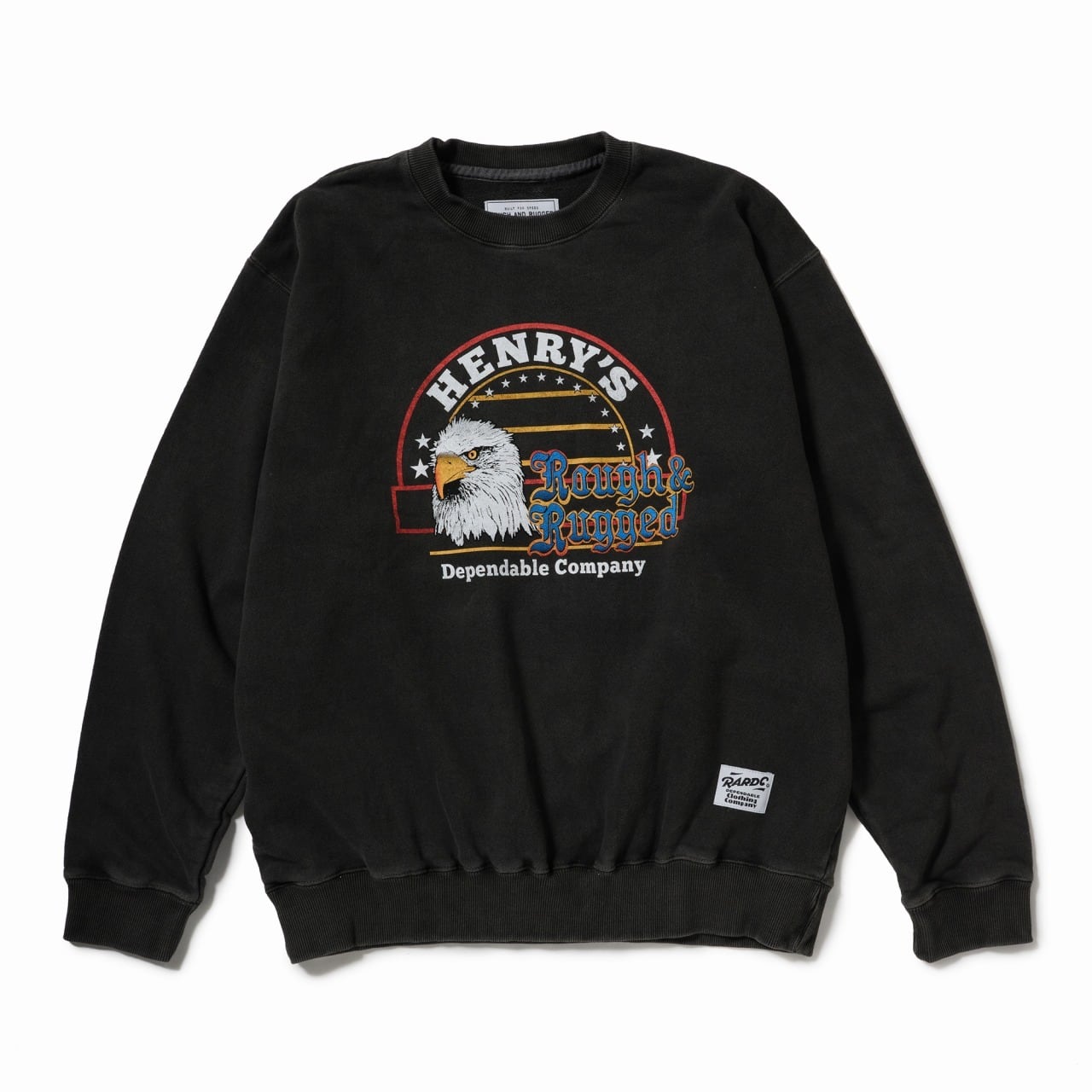 ピグメント染めのボディにビンテージの様なプリントは5版を使用したカラーディメンションが美しく、ブランド部分のグラデーションは技術が伴われます。経験豊富な日本の職人によって1枚1枚丁寧に再現されています。着込むほどに味わい深くなる1枚です。