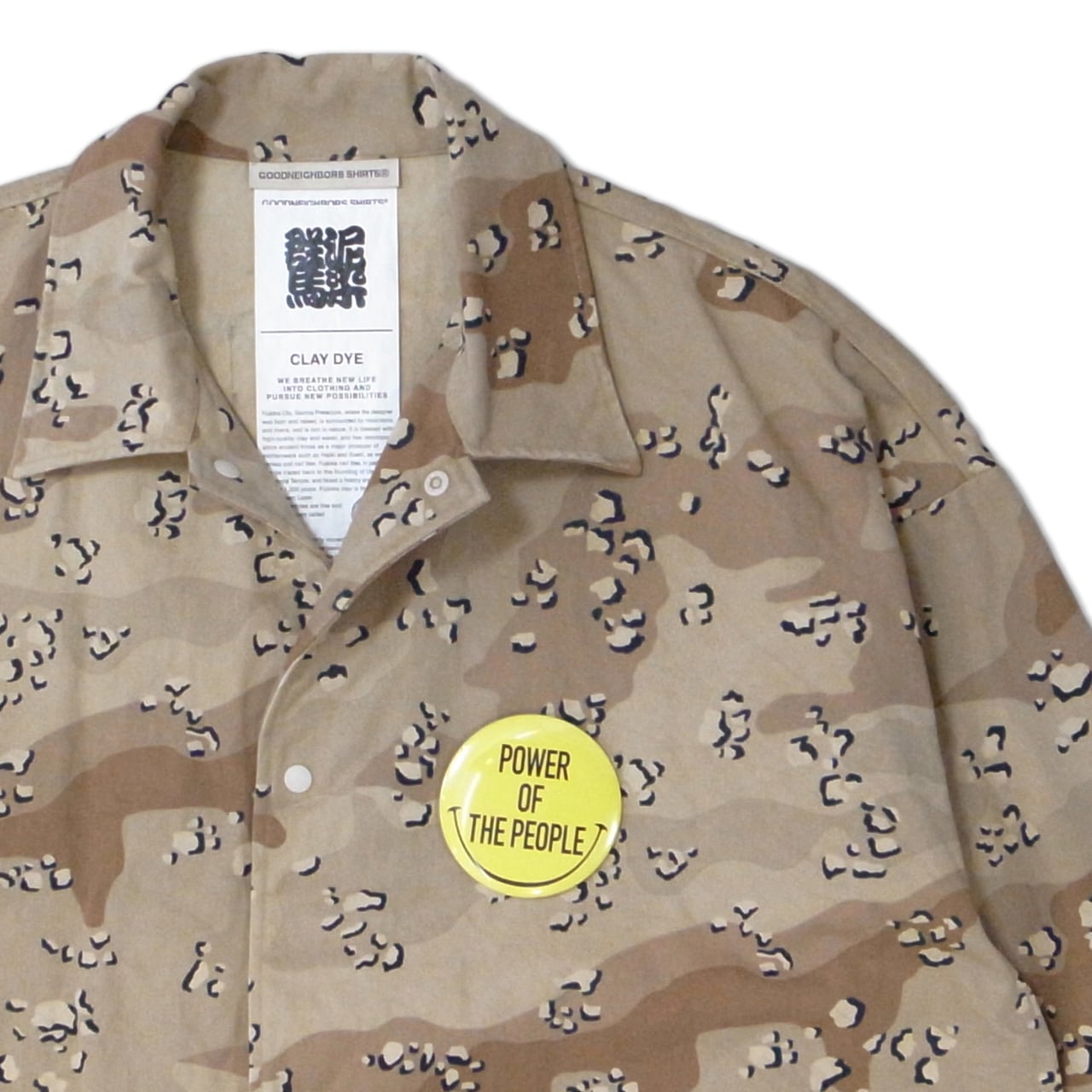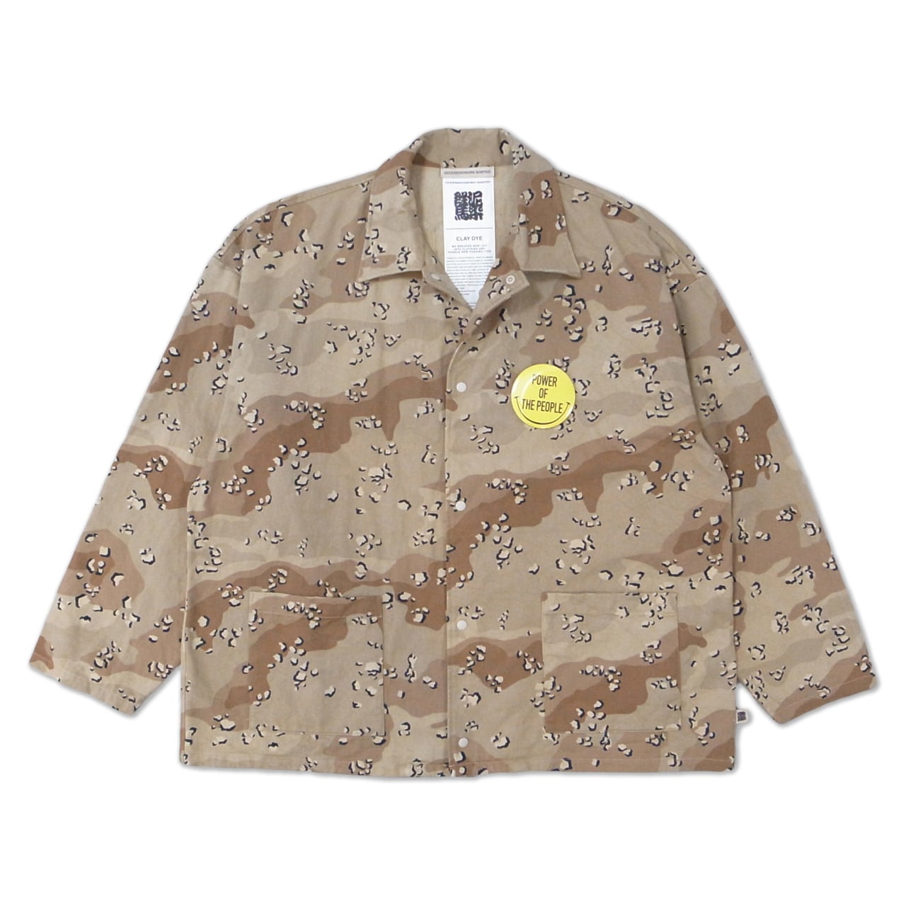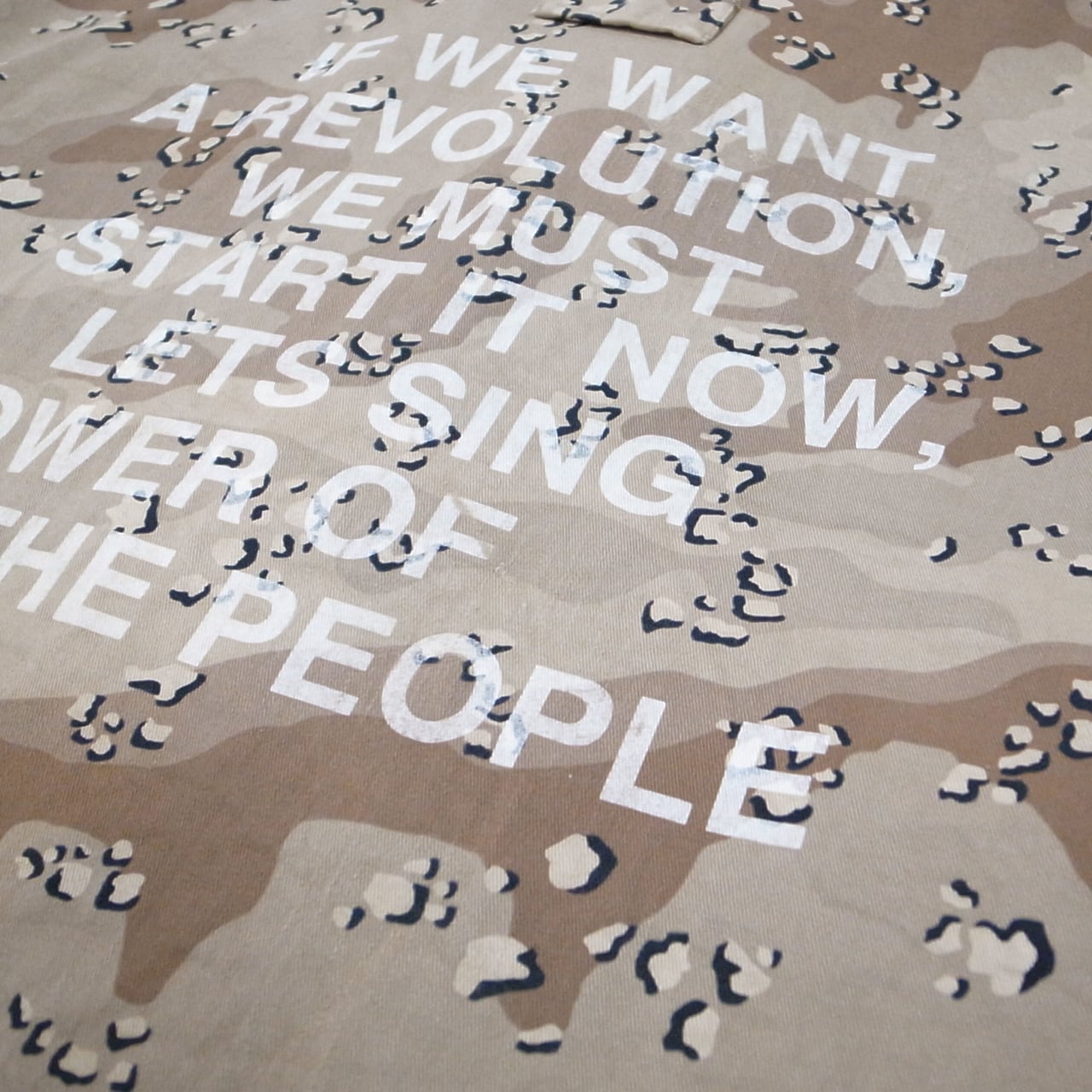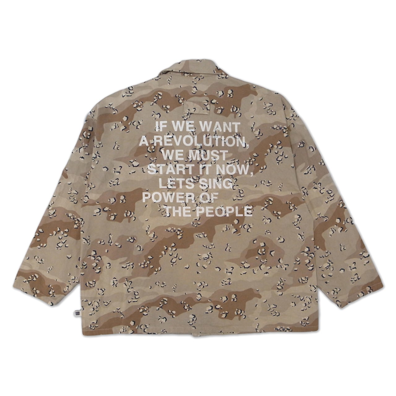 今期のテーマ「Power of the people」に沿ってデザインされたジャケット。デザートカモフラージュ柄のハリのあるコットン生地をシャツジャケットに仕立て、メッセージをプリント。