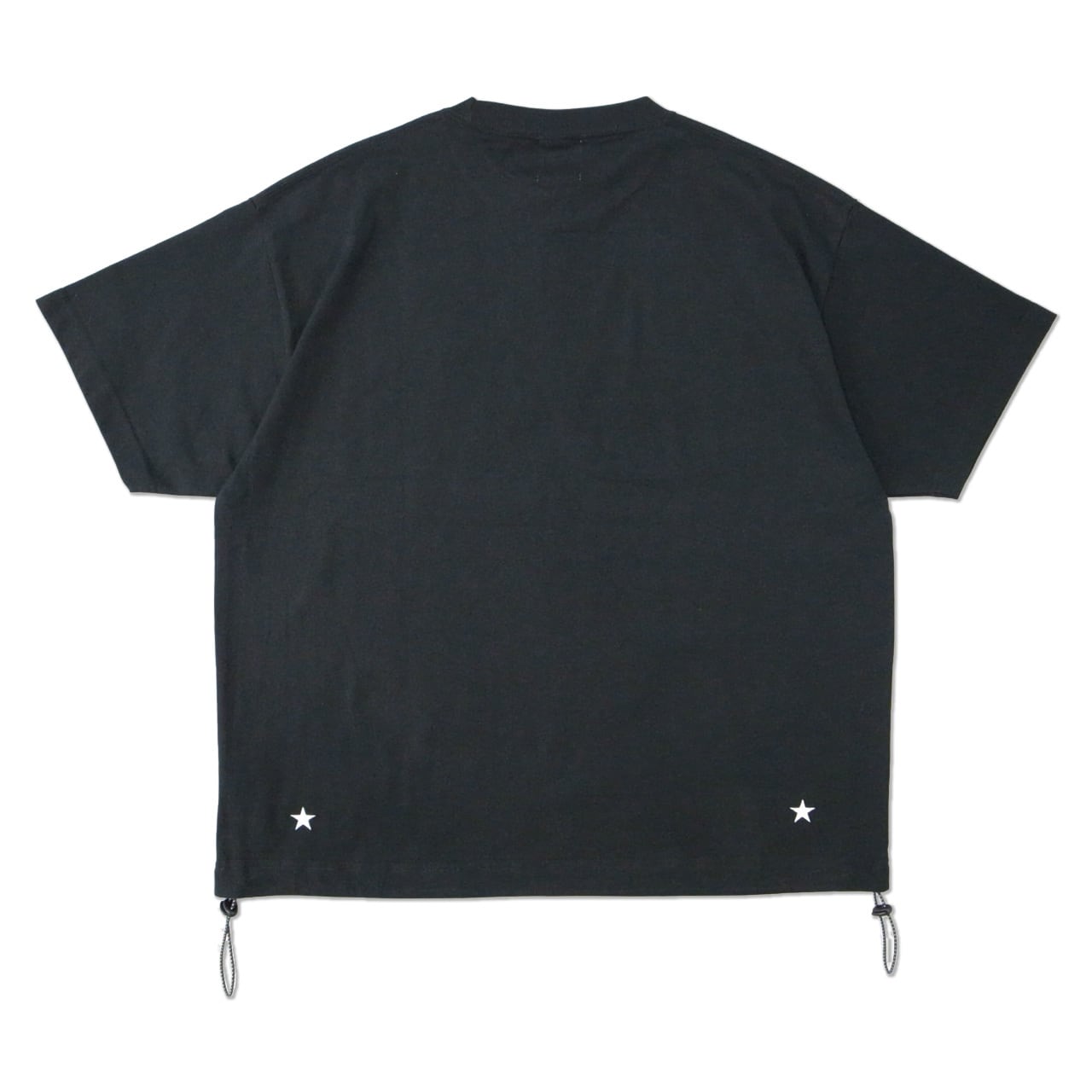 左右の裾口に、バイカラーのドローコードをアクセントとして配したT-シャツ。ドロップショルダーによるゆとりのあるシルエット。裾を絞ることで丈感やフォルムを自在に調整でき、絞らずに着用すればリラックスした印象。FRONTにロゴ刺繍、BACK裾に★刺繍を配置。