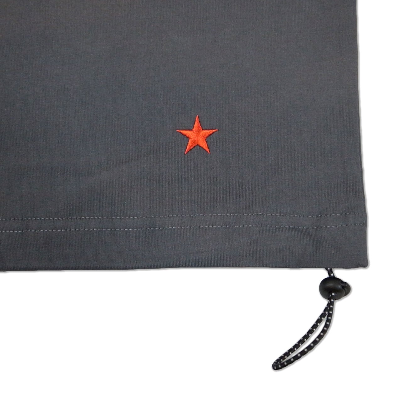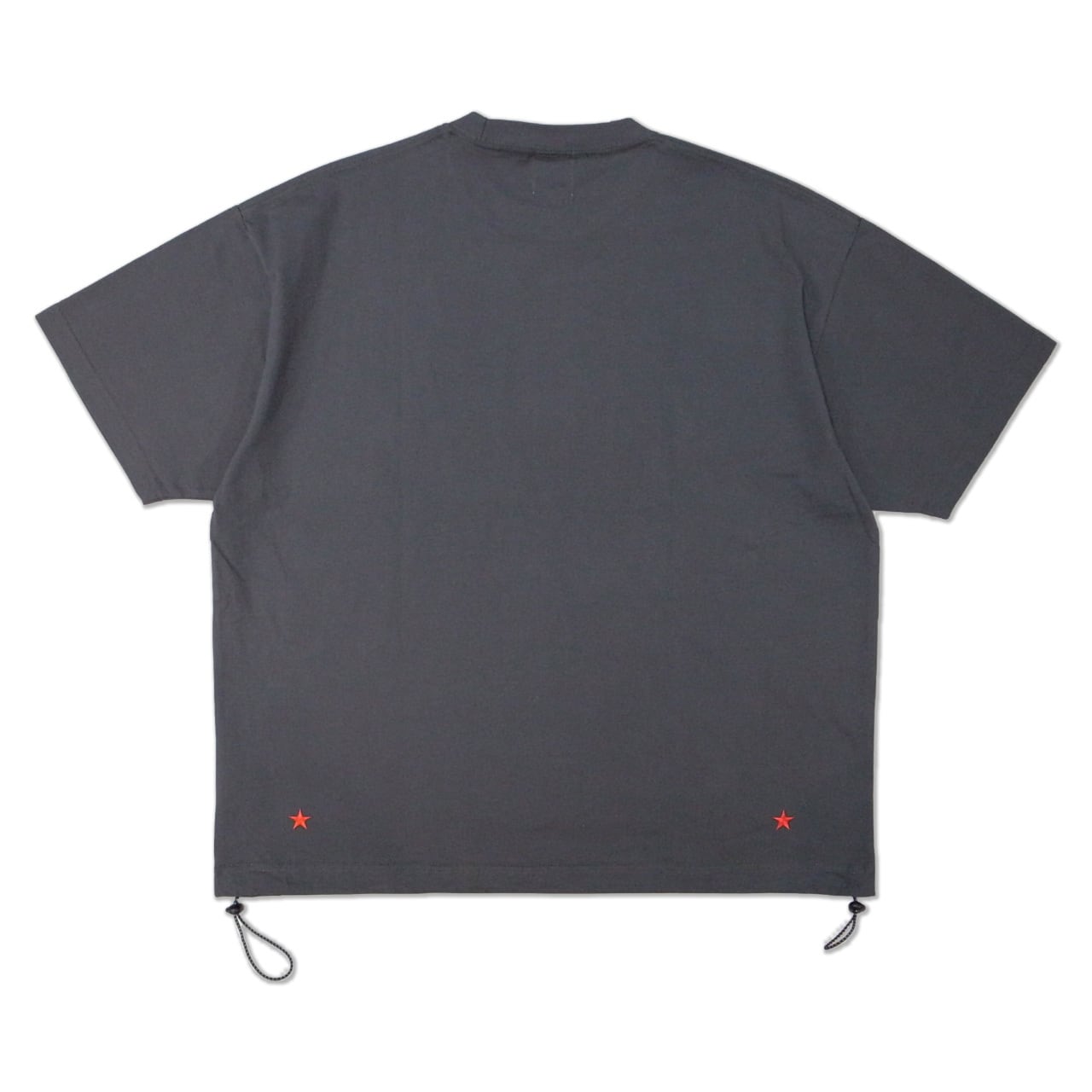 左右の裾口に、バイカラーのドローコードをアクセントとして配したT-シャツ。ドロップショルダーによるゆとりのあるシルエット。裾を絞ることで丈感やフォルムを自在に調整でき、絞らずに着用すればリラックスした印象。FRONTにロゴ刺繍、BACK裾に★刺繍を配置。