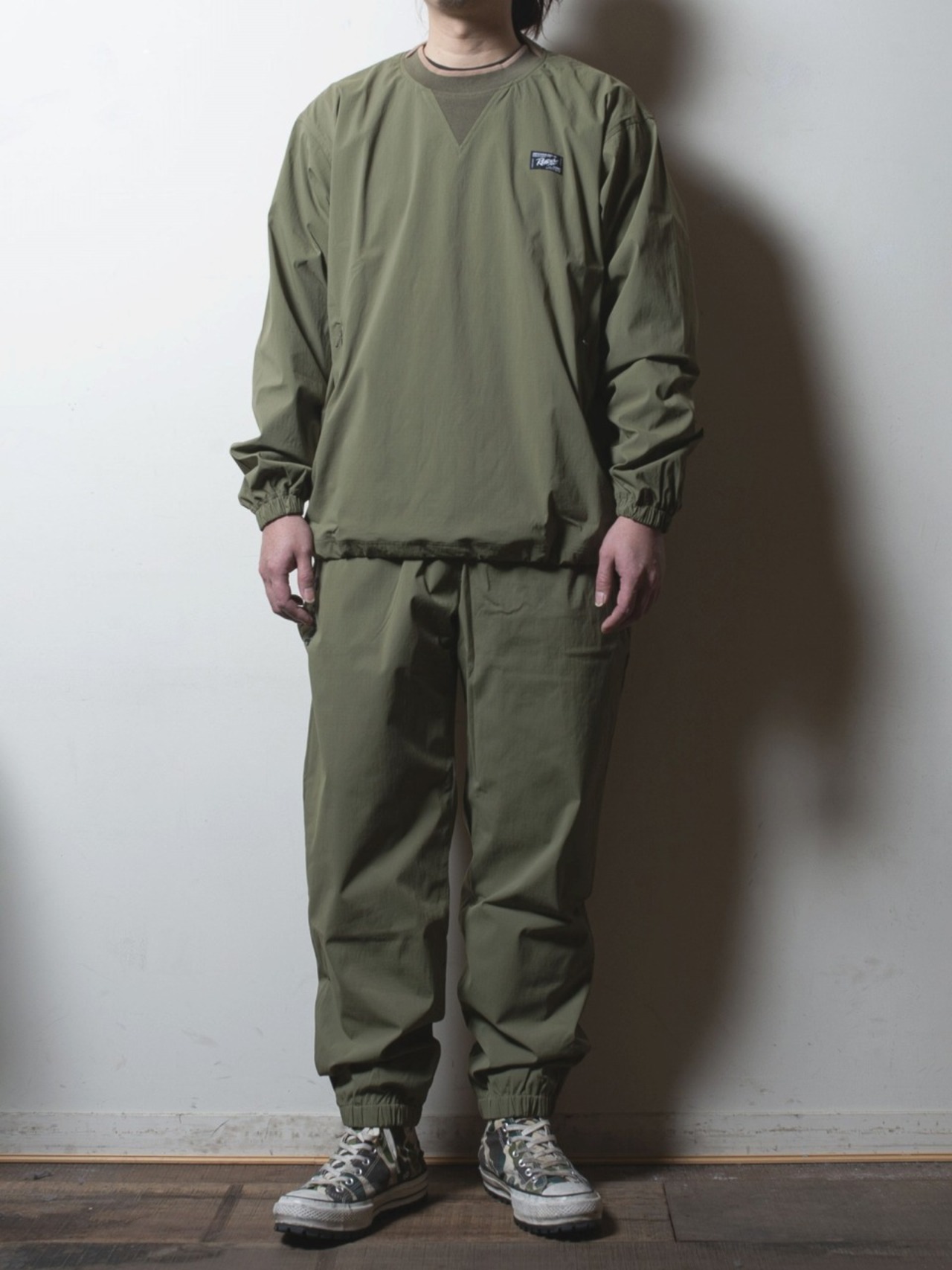 ミリタリートレーニングウエアをデザインソースに製作。「RDJ963」とのセットアップ着用が可能で、過度な装飾を取り除いた男らしいソリッドなアイテム。運動機能を重視し、ゆとりを持たせながらも野暮ったくならないパターンメイキングを目指して製作しました。