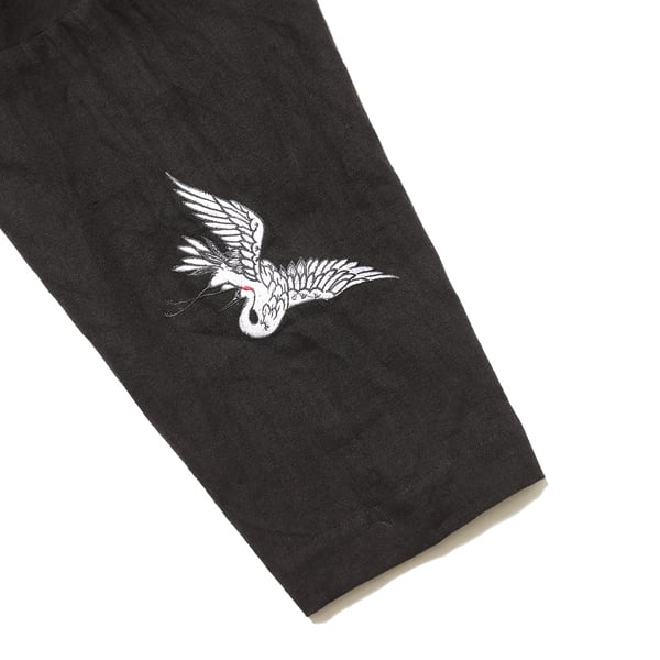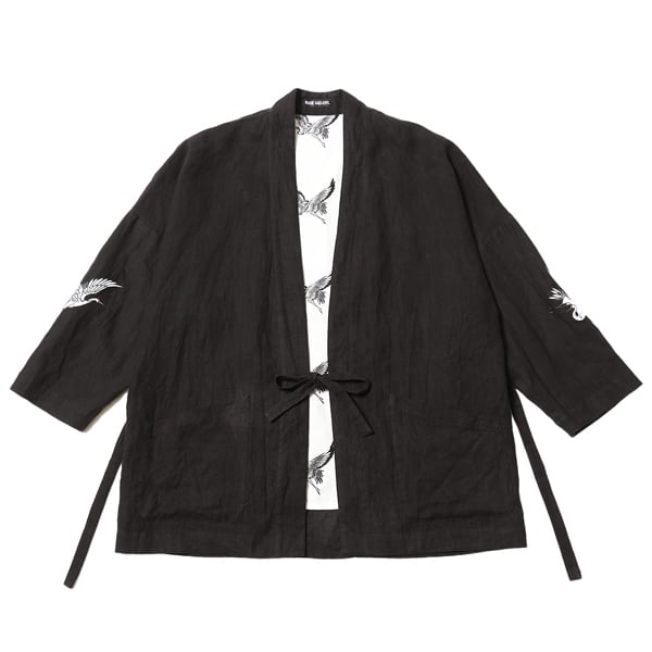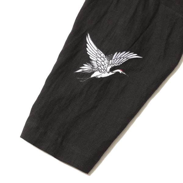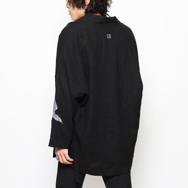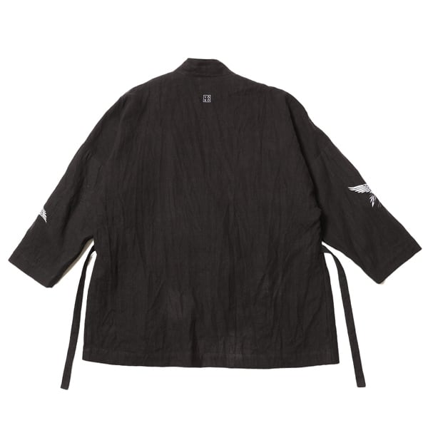 表地には通気性と軽やかさを兼ね備えたリネン素材を使用。両袖口には鶴の刺繍を配し、さりげないアクセントを加えました。